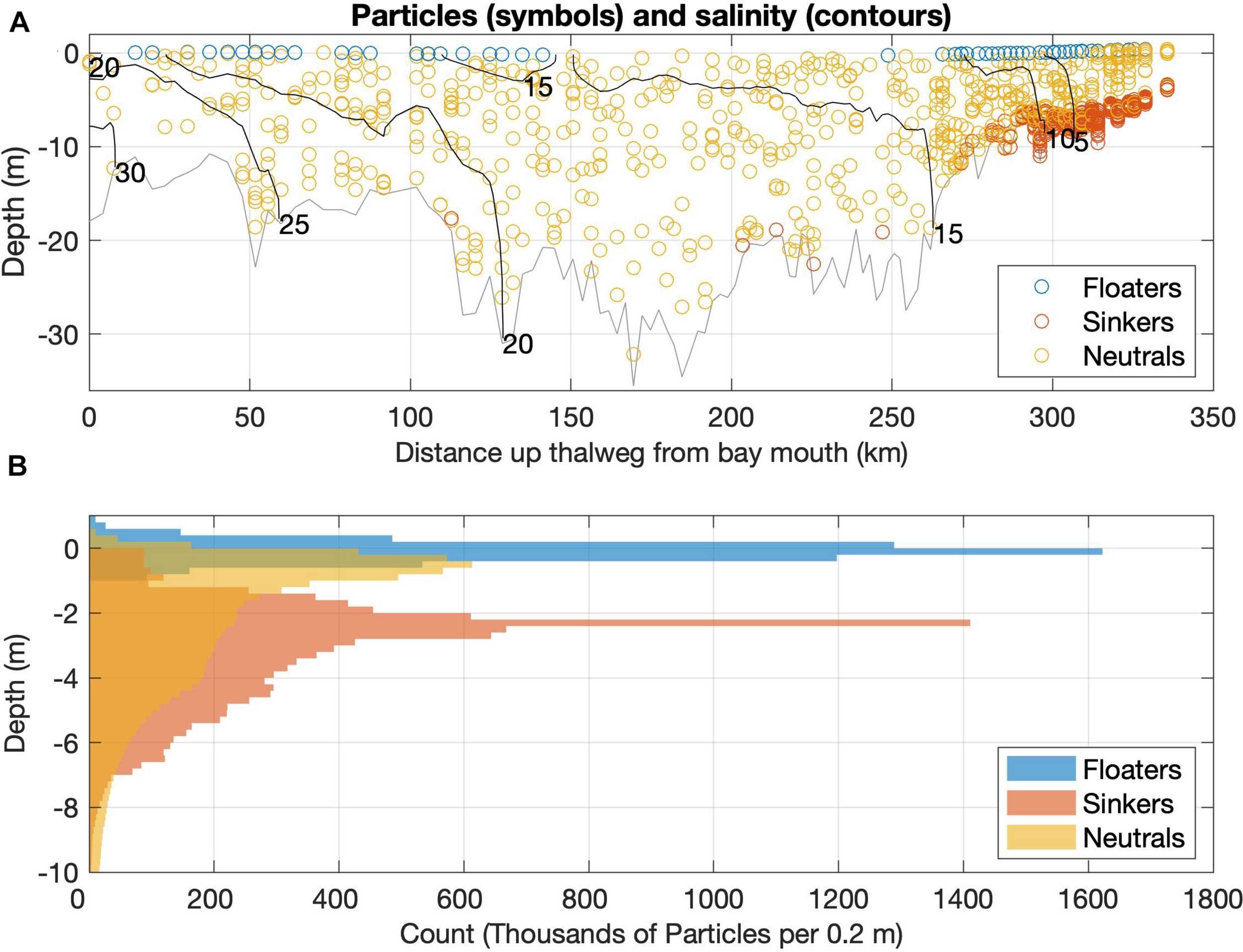 (A) Particle locations and salinity within a transect one grid point wide along the thalweg on the final day (366th day, January 1, 2011) of the composite simulation. (B) Particle abundance integrated over time and horizontal extent vs. depth over the course of the 1-year composite simulation for floaters, sinkers, and neutral-density particles. Each point on the plot is the cumulative sum over all days for particles within a depth interval of 0.2 m.