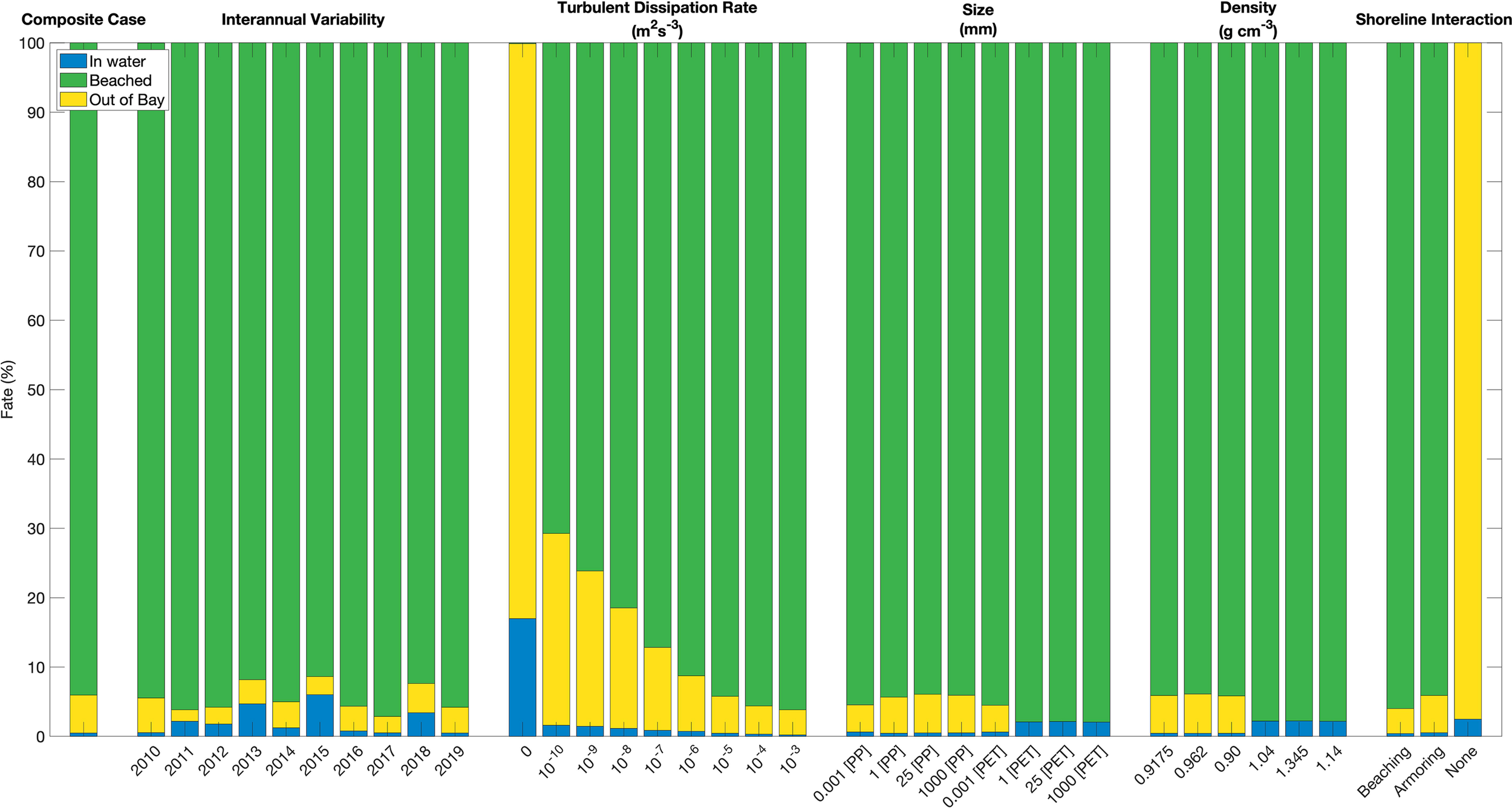 In contrast to particle size, particle density had a profound influence on the microplastic fate (Figure 8). All particles with densities less than the water behaved very similarly with respect to particle fate with 5% of particles exiting the Bay, and 93% of particles beaching within the Bay (Figure 8). A similar agreement was seen amongst the three cases with densities greater than the water, with 0% of particles exiting the Bay. However, the PET and PA6 cases are more similar to one another than to the PS case, the latter having a density only slightly greater than Bay water. A particle’s distribution and residence time is sensitive to whether its density is greater or less than that of the surrounding water, but not meaningfully affected by how much greater or less than its density is to that of water.