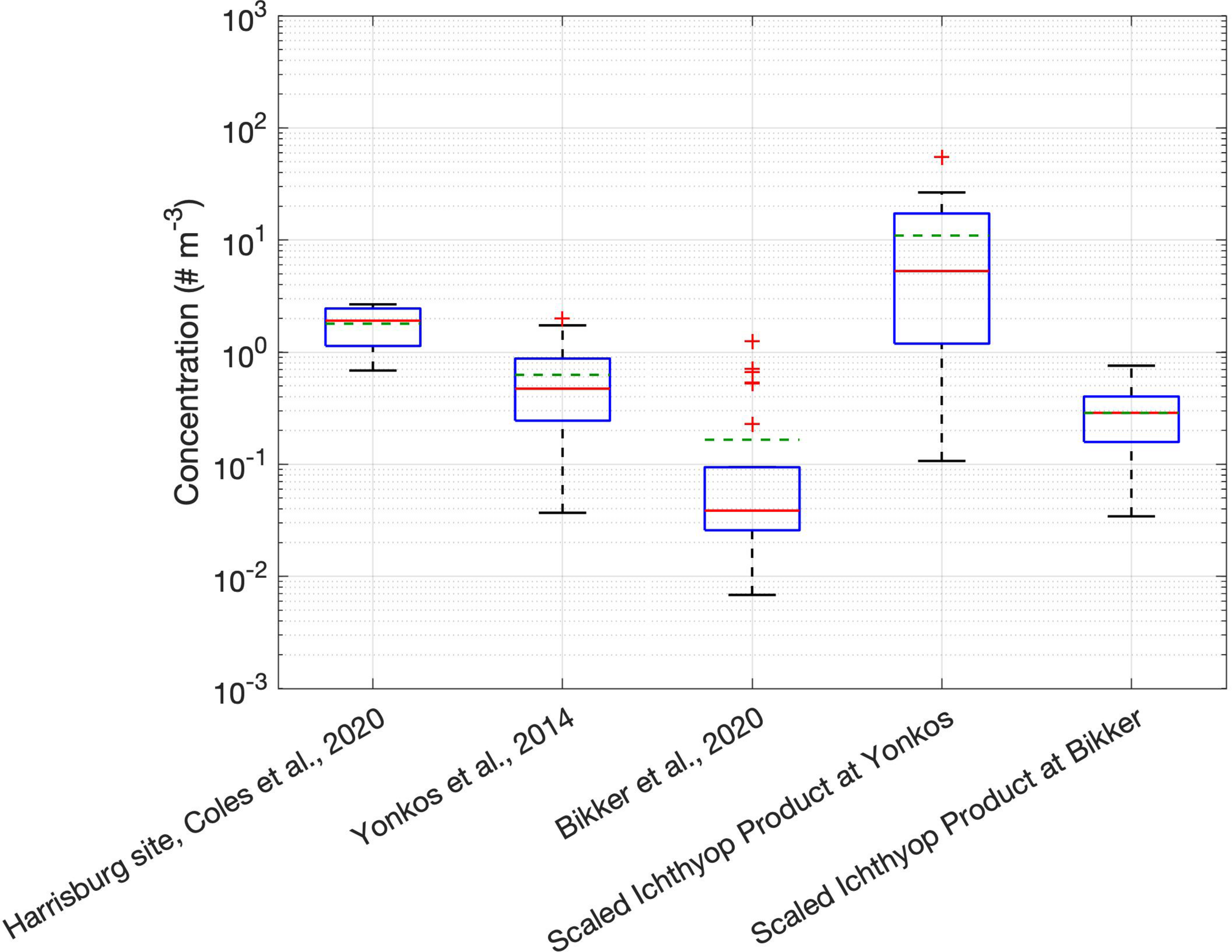 Box plots of concentrations from three observational studies, as well as scaled model concentrations from the same bay locations used in Yonkos et al. (2014) and Bikker et al. (2020). Green dashed lines denote the mean, while red denotes the median. Scaling was done by taking the 7-day model mean centered on the date of observation, then multiplying the model concentration for each observation by the ratio between the median of the observed concentration at the Harrisburg USGS station from the Coles et al. (2020) dataset and the concentration of particles (1.157 × 10–5 m–3) added to the particle tracking model. Note there is no Scaled Ichthyop Product for the Coles et al. (2020) dataset, as the observation sites are either outside of the model domain or within the model mask.