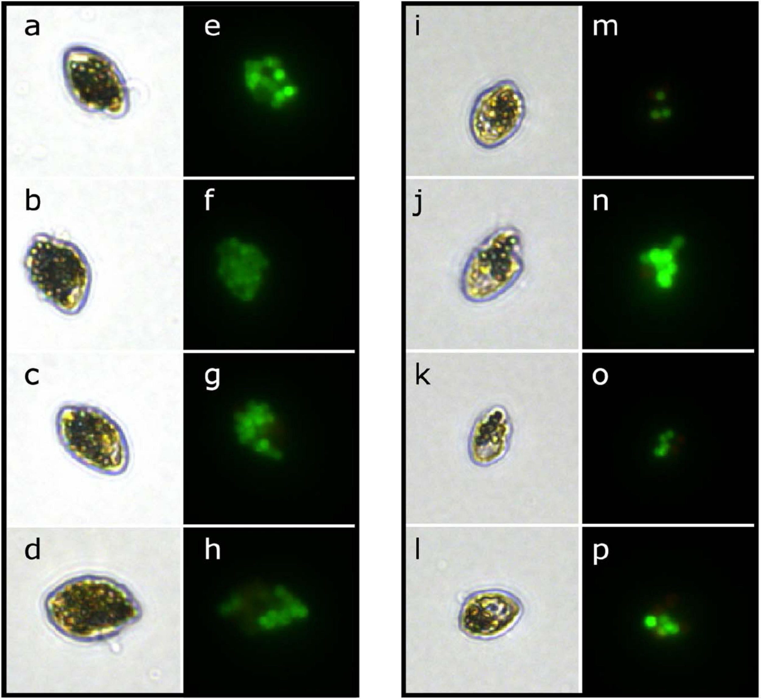 Micrographs of the heterotrophic dinoflagellates O. marina (left column) and Gyrodinium sp. (right column) with microplastic beads (fluorescent green) ingested under light (a–d,i–l) and epifluorescence (e–h,m–p) illumination.