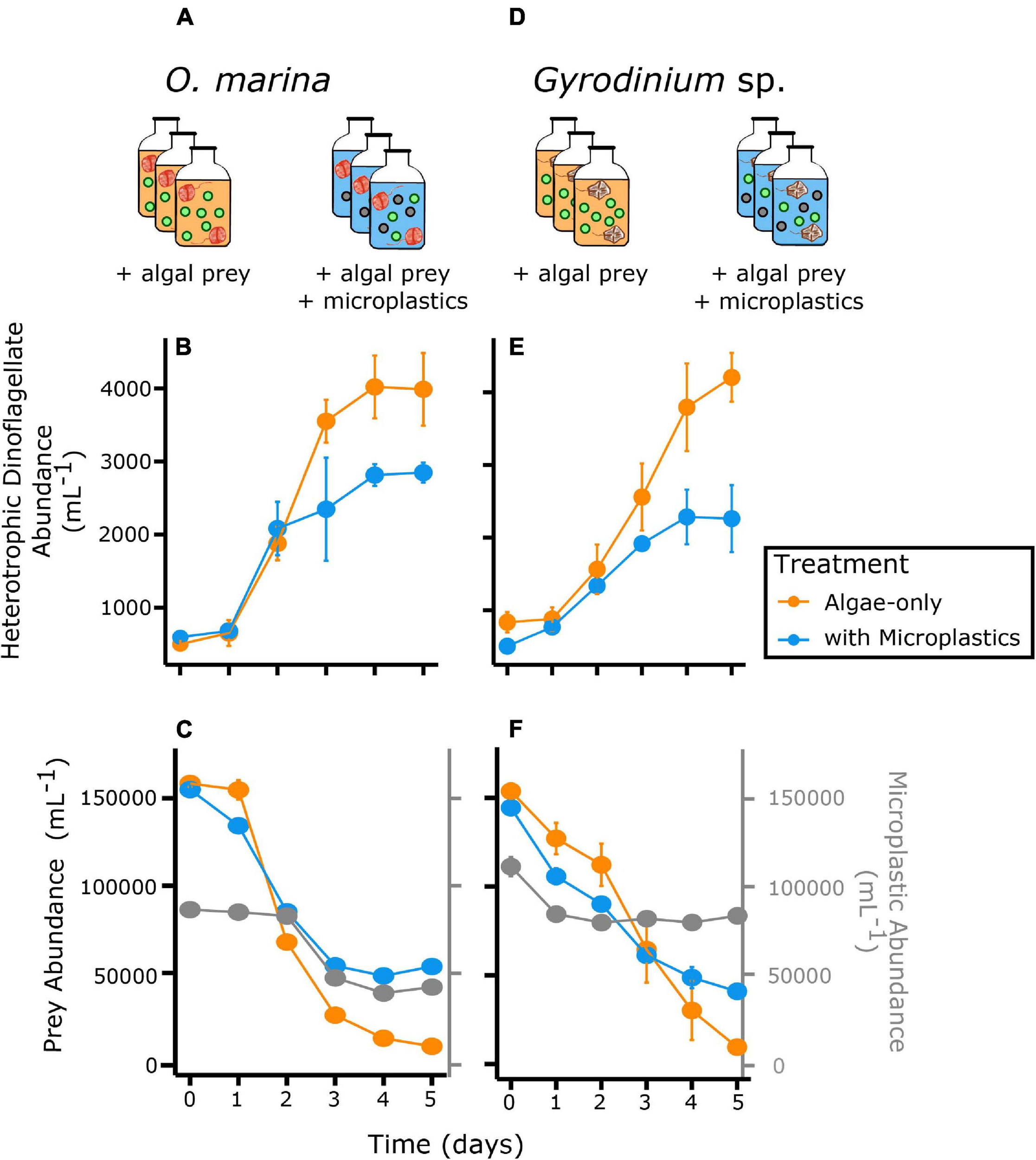 Abundance of heterotrophic dinoflagellates in two feeding treatments, algae only (orange) and a mixture of microplastics with algal prey (blue) over time. The top row shows the experimental setup, with triplicate bottles of each treatment for each species. The second row shows abundance of O. marina(A–C) and Gyrodinium sp. (D–F) and third row, abundance of prey and microplastics for the respective predator treatments. Gray points represent the microplastic particle abundance in the treatments with microplastics. Error bars indicate one standard deviation of the mean, which is contained within the symbol for many measurements.