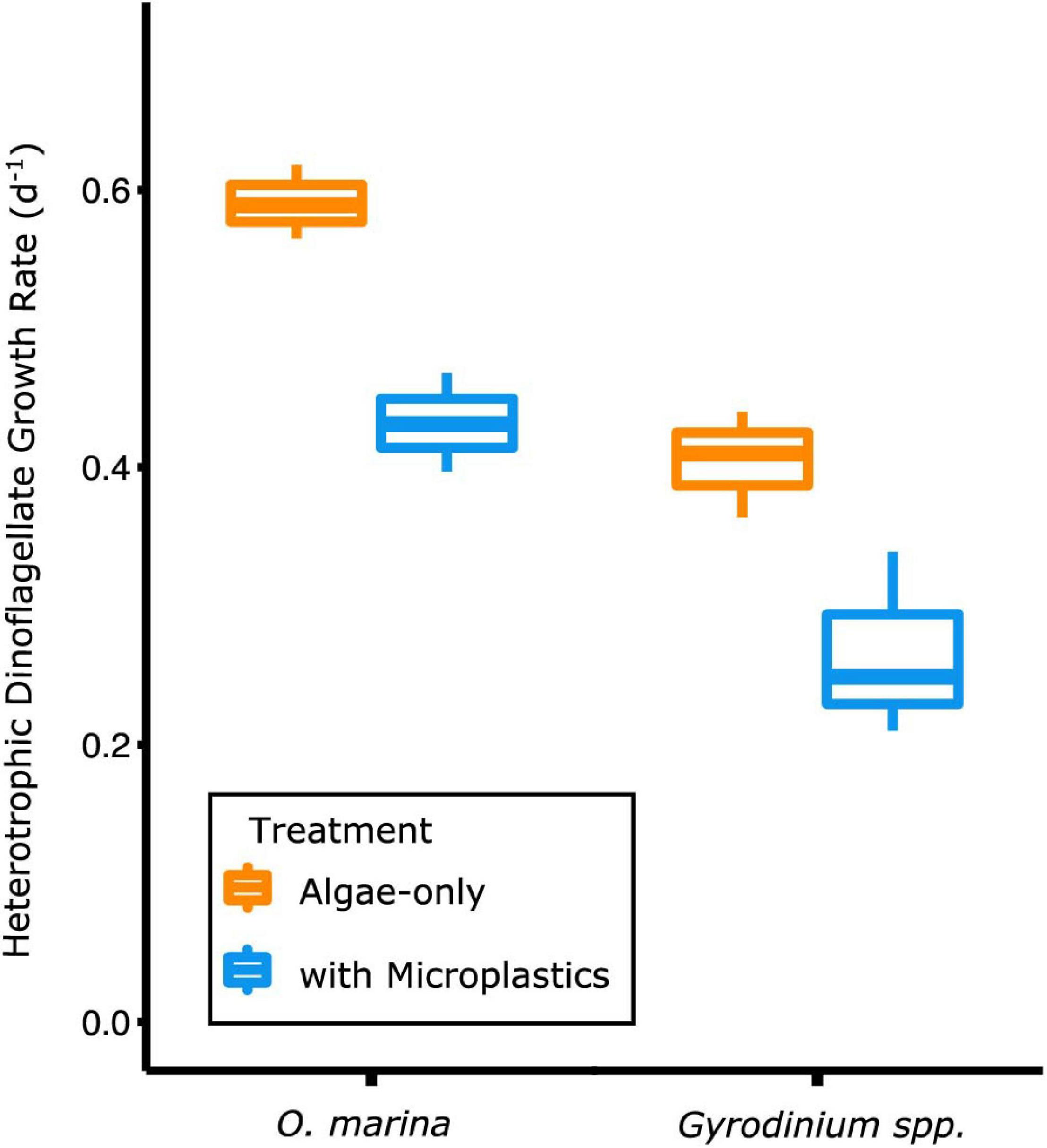Heterotrophic dinoflagellate growth rates during the exponential growth phase were higher when dinoflagellates were fed only algal prey (orange) and lower when fed a mixture of algal prey and microplastics (blue). The box plot shows median, the 25th–75th percentiles, and error bars as the 95% confidence interval.