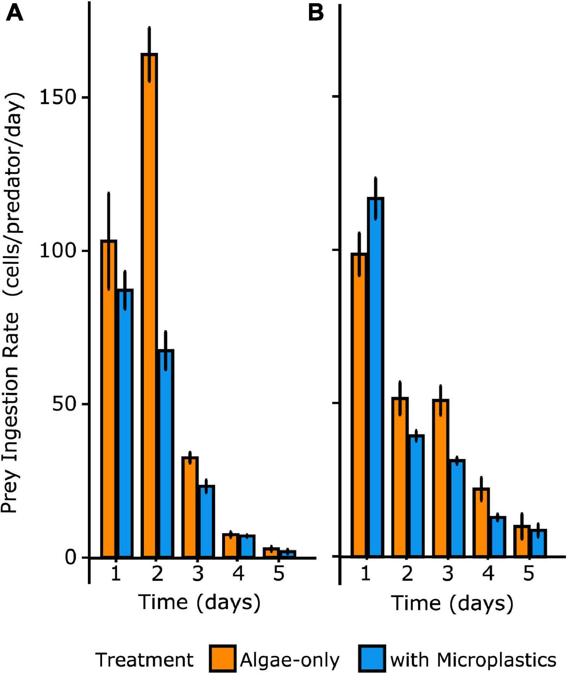 Over the course of the 5-day experiment, each treatment was fed only at day 0, allowing the observation of ingestion rates over time in a closed system. O. marina had an average ingestion rate of 62 ± 7 cells predator–1 day–1 in the algae-only treatment and an average ingestion rate of 37 ± 5 cells predator–1 day–1 in the treatment with microplastics. O. marina in the algae-only treatment reached a maximum ingestion rate of 164 ± 15 cells predator–1 day–1 on day 2, at which point the ingestion rate was over twice as high as in the treatment with microplastics on the same day (ingestion = 67 ± 10 cells predator–1 day–1 on day 2) and nearly double the maximum ingestion rate reached over the course of the treatment with microplastics (maximum ingestion = 87 ± 10 cells predator–1 day–1) (Table 2).