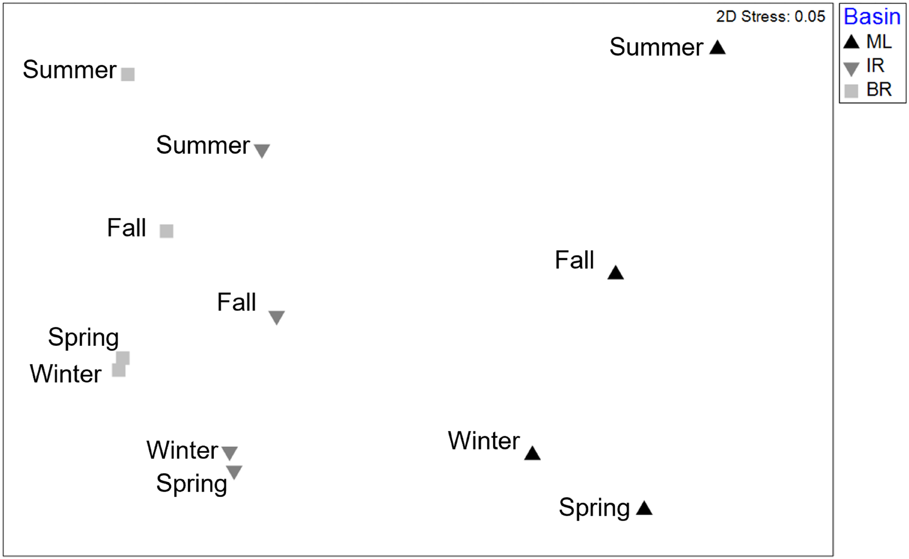 Abundance differed among basins but not consistently among years or seasons (season × year interaction: F2,590 = 9.04, p = 0.001). This interaction was explored by analyzing within years. Abundance was lower in ML than in the IR and BR (Figure 1C). In 2014, abundance was lower in the IR and ML than the BR and did not differ between summer and fall samples (Table 3 and Figure 1C). In the ML, abundance was lower than in the IR and BR and lower in summer and winter than in fall and spring of 2015. In 2016, abundance did not differ among basins or between seasons.