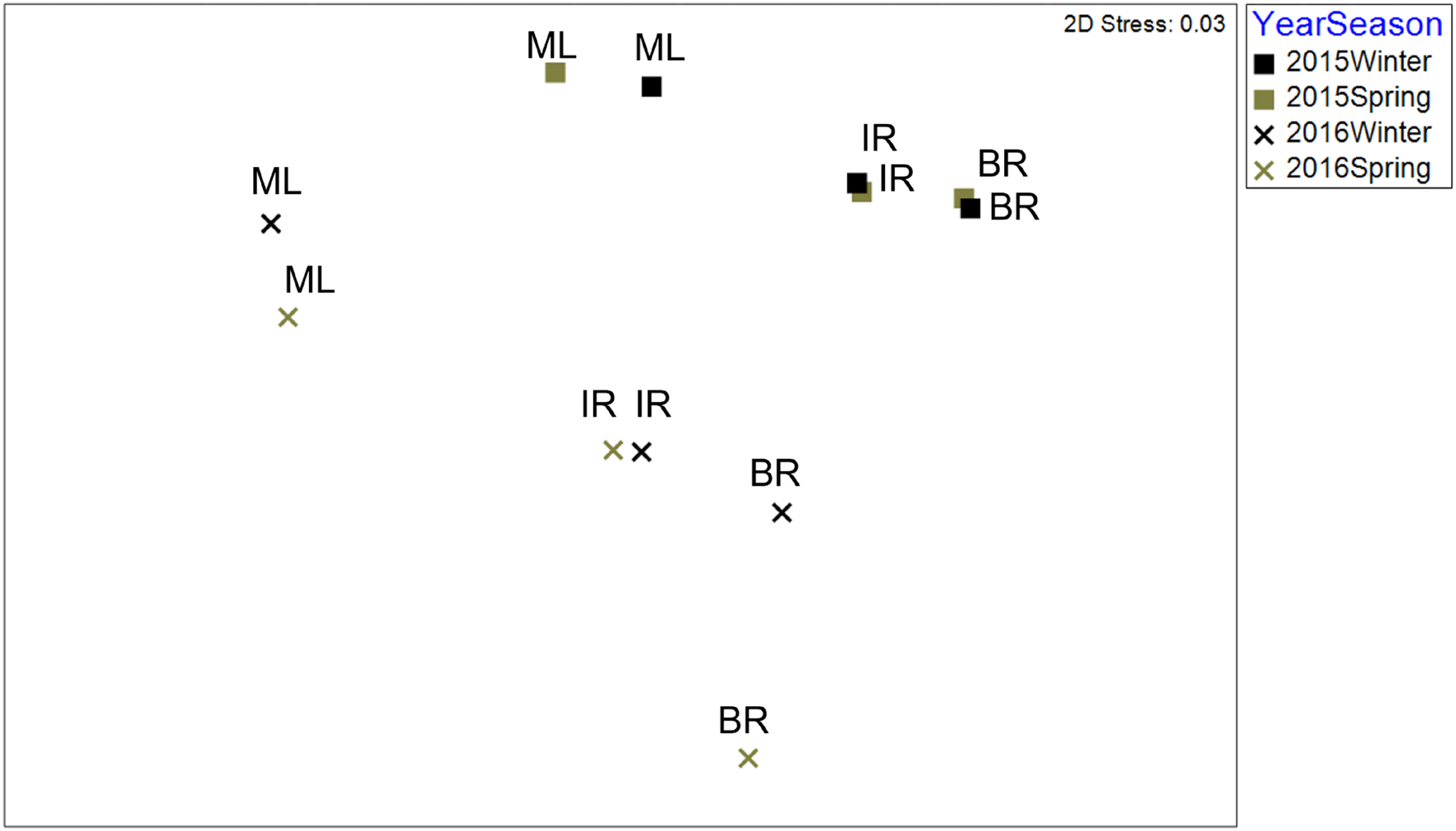 Species richness differed between seasons, but these differences were not consistent across basins (season × basin interaction: F5,590 = 3.34, p = 0.006). This interaction was explored by analyzing within basins. Species richness decreased in the summer of 2015, most prominently in the ML (Figure 1B). Species richness in the BR was lower in 2016 and was higher in the summer than in the other seasons, which did not differ (Table 2). Species richness in the IR was lower in 2016 and was lower in the fall than in the other seasons, which did not differ. Species richness in the ML was lowest in 2016 and highest in 2014 and was lowest in summer and highest in winter.