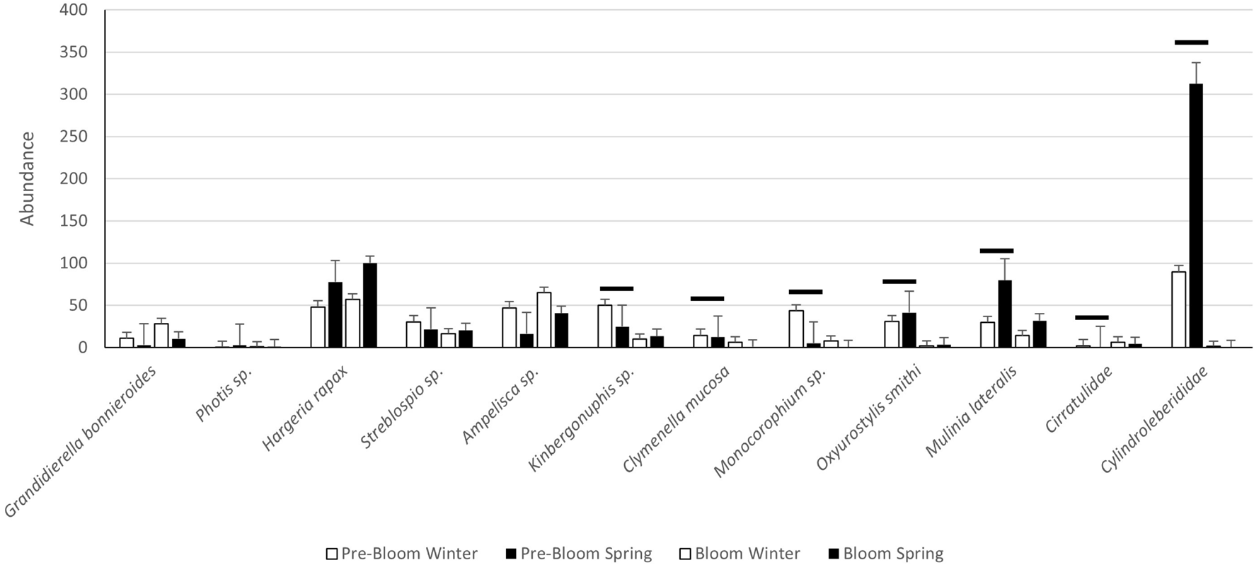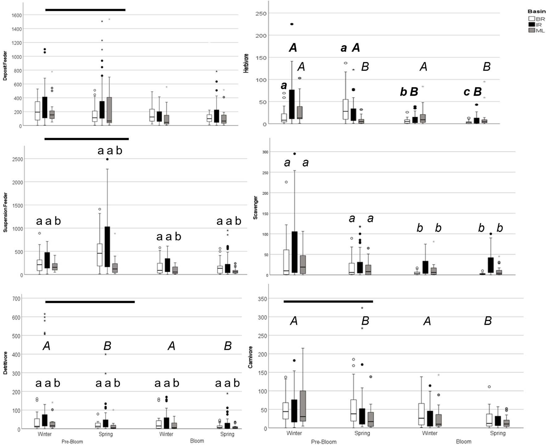 A brown tide was reported throughout the northern IRL in early 2016 (Schaefer et al., 2019). Using data from St. Johns River Water Management District’s water quality monitoring program, chlorophyll a data for the three basins was compared with survey site locations. Infaunal communities were compared before and during the 2016 brown tide using PERMANOVA with bloom, season, and basin as factors. Species responsible for the patterns were explored using the SIMPER program in PRIMER. Abundance patterns of these species were explored using a three-way ANOVA with bloom condition, season, and basin as factors. To examine interactions, species were separated by basins and analyzed using a two-way ANOVA with bloom condition and season as factors. Additionally, Shannon–Wiener diversity was compared between pre-bloom and bloom years using a three-way ANOVA with bloom, season, and basin as fixed factors. The feeding types (e.g., deposit, suspension, etc.) of the identified taxa was determined through a review of the literature. Within the community samples we identified deposit feeders, suspension feeders, detritivores, herbivores, predators, and scavengers. Scavengers were not identified among the species collected for isotope analysis. Abundances were pooled within feeding types and the response of these feeding types to the bloom were examined using a three-way ANOVA with bloom condition, season, and basin as factors. When a significant interaction was found, feeding response was examined separately by basin. To account for fewer samples taken during the bloom, only the corresponding pre-bloom samples in winter (January) and spring (April) of 2015 were used for comparison. Significant basin × season interactions within the three-way ANOVA were investigated using a two-way ANOVA within basin with bloom condition (pre- and bloom) and season (winter and spring) as factors. Data was log transformed to meet assumptions.