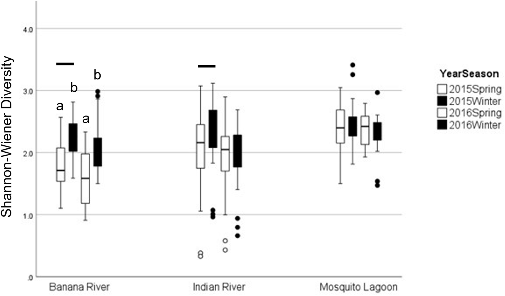 Community metrics for the 27 quarterly sampled sites. Boxplots represent minimum, first quartile, median, third quartile, and maximum, with circles denoting outliers. (A) Shannon–Wiener diversity was analyzed within years because of a significant interaction between year and basin. Lower case letters (a) denote differences among basins, upper case italics (A) denote differences among seasons within 2015. (B) Species Richness was analyzed within basins because of a significant interaction between season and basin. Lowercase italics (a) denote differences among seasons. For the Mosquito Lagoon fall and spring samples were intermediate to summer and winter samples, but the (ab) designation has been left out for readability. Bars denote differences among years. (C) Abundance was analyzed within years because of a significant interaction between year and basin. Lower case letters (a) denote differences among basins, upper case italics (A) denote differences among seasons within 2015.