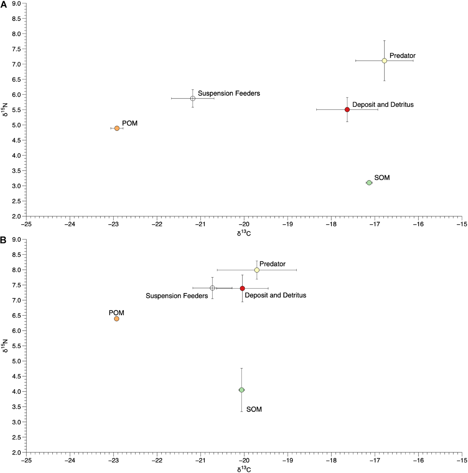 After identification (Supplementary Table 2), each individual organism was placed into a 7 mL scintillation vial or, to obtain enough biomass for isotope analysis, several individuals were pooled into one vial (Galván et al., 2008; Supplementary Table 2). Individual water samples (8–12 L per sample) from each site were filtered through Millipore quartz fiber filter (2 μm porosity) to retain POM (Freeman et al., 2018). Samples of infaunal organisms, sediment, and filters were dried at 60°C. Infaunal tissue and sediment were then homogenized to a fine powder using a mortar and pestle. Homogenized infaunal tissue for each sample was then split evenly between two vials and tissue in one vial of each pair was acidified to remove carbonate that can lead to enriched (higher) δ13C values by dripping 1N HCl onto infaunal tissue until bubbling stopped. All sediment samples were also processed this way, but dried filters were acidified by exposure to 12N HCl fumes in a sealed desiccator for 12 h and then returned to a 60°C oven for 12 h to remove residual acid. After bubbling stopped, infaunal tissue and sediment samples were dried at 60°C. Acidified and unacidified samples of infaunal tissue, sediment, and organic matter retained by filters were weighed into tared tin capsules to the nearest 0.001 mg. Isotope analysis was carried out at the Stable Isotope Facility at UC Davis using a PDZ Europa ANCA-GSL (for infaunal tissue samples) or Micro Cube [for POM and sediment (herein referred to as SOM for sediment organic matter) samples]] elemental analyzer interfaced to a PDZ Europa 20–20 isotope ratio mass spectrometer (Sercon Ltd., Cheshire, United Kingdom). The long-term standard deviation is 0.2‰ for 13C and 0.3‰ for 15N. Delta values are expressed relative to international standards Vienna Pee Dee Belemnite (VPDB) and Air for carbon and nitrogen, respectively. Isotope values are reported in δ notation (δ15N and δ13C) in units per mill (‰). Both acidified and unacidified samples were analyzed to determine whether acidification also impacted δ15N values.