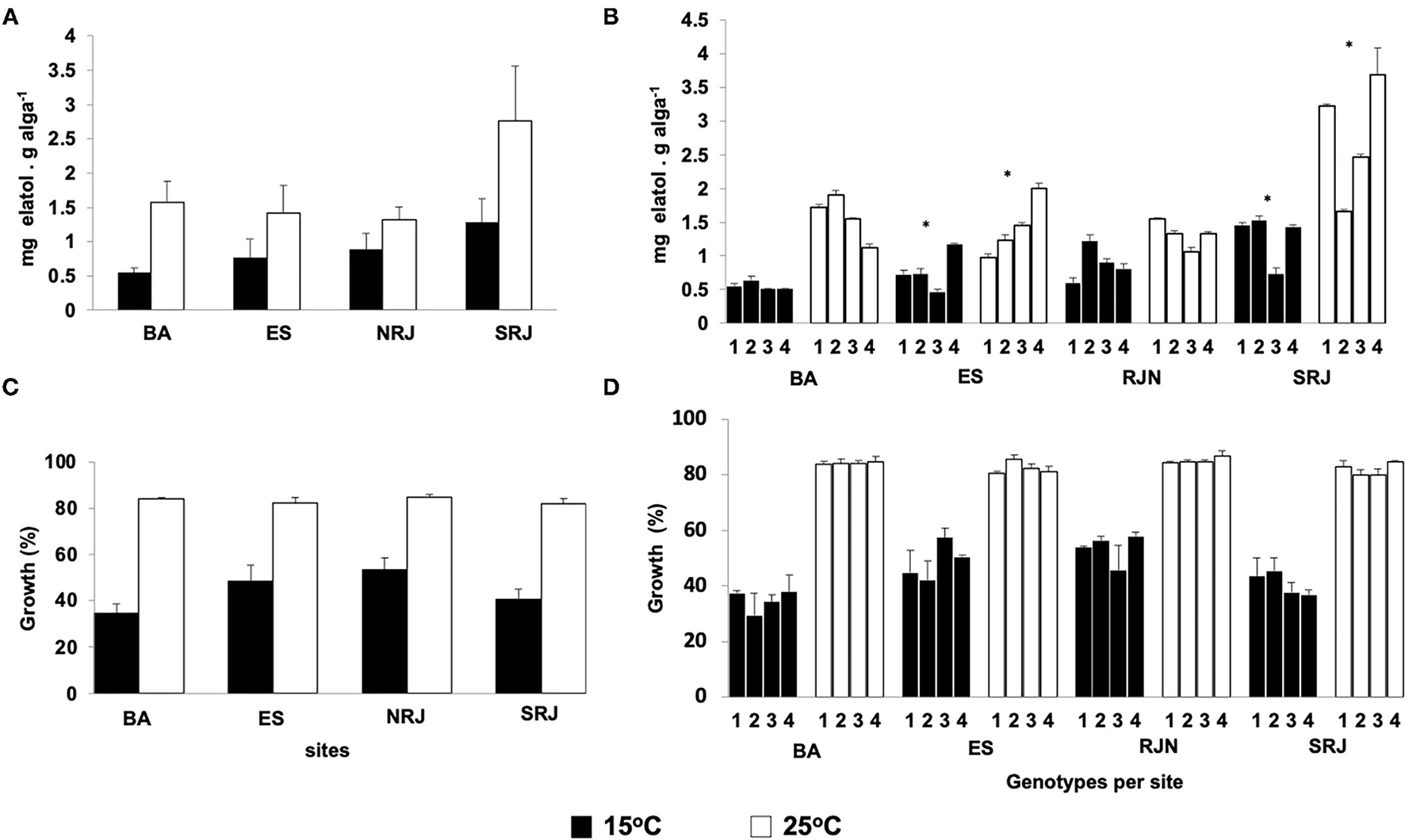 Effect of temperature on the chemical defense and growth of L. dendroidea specimens under laboratory-controlled conditions. At 25°C, elatol levels (A) and growth (C) were higher than at 15°C. Elatol levels differed between genotypes (n = 3) despite similar growth conditions for ES and SRJ populations (B). The mean growth (±SD) of each genotype (n = 3) was similar at 15 and 25°C (D). Numbers 1, 2, 3, and 4 correspond to the distinct genotypes of the unfertile sporophyte lifecycle phase. *Genotypes are significantly different. Sites and statistical notation as in Figure 1.