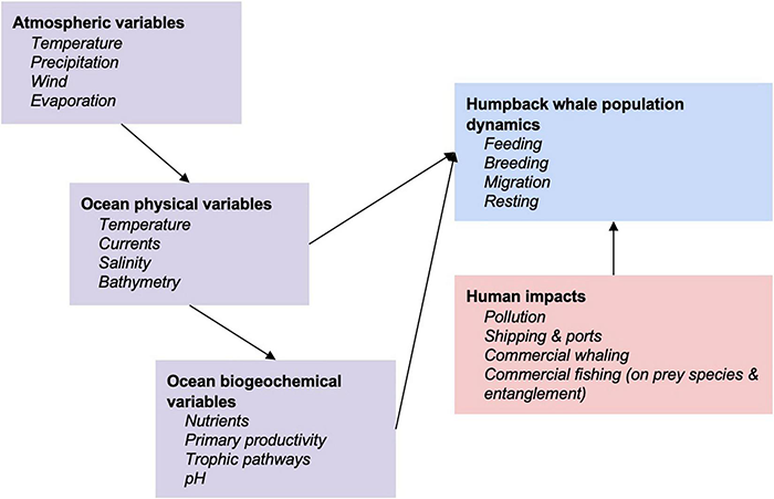 Conceptual framework to a systems approach of understanding humpback whale responses to environmental variables and human impacts (adapted from Meynecke et al., 2020).
