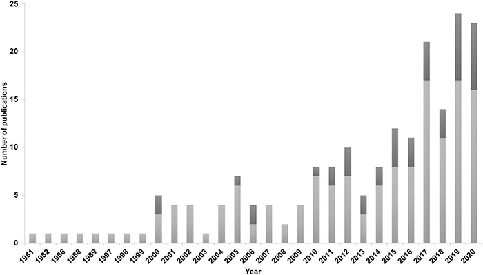 Number of retrieved studies investigating humpback whales and environmental drivers between 1981 and 2020. Dark gray bars indicate mention of climate change or climate shift in the studies.