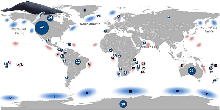 Humpback whale populations (at least 16 distinct populations shown as combined North-East Pacific, North Atlantic, Arabian Sea, North-West Pacific for the Northern Hemisphere and A-G breeding populations for the Southern Hemisphere) with approximate breeding (red) and feeding (blue) areas (classification based on Jackson et al., 2015). The number of studies extracted from 148 publications that investigated environmental drivers and humpback whale distribution are shown by country and separately for Antarctica.