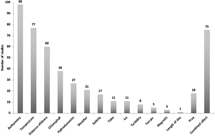 Bathymetry, temperature, distance to shore and their associated variables were the most common parameters investigated, being included in 137 studies. Fewer publications have included the effects of variables such as chlorophyll concentration, hydrodynamics, weather, salinity, and tides. Out of the 148 studies, bathymetry and associated variables were investigated 98 times, SST 77 times and distance to shore or ice edge 60 times. The categories turbidity (8), terrain type (5) and magnetic fields (3) were the least tested and 18 studies included prey as an additional variable (Figure 5).