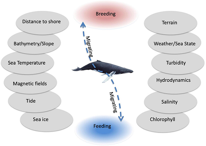 A wide range of environmental conditions are encountered in these habitats, and HWs are able to identify and adapt to preferred conditions for their most important life stages or behavioral ‘modes’ herein referred to as breeding, feeding, migrating, and resting. Given the different habitats used and their mobility, migratory species have spatially broad ecological niches (Guisan and Zimmermann, 2000). Underlying reasons behind HW habitat selection are still debated (Corkeron and Connor, 1999). Different habitats may be favored depending on whether migration occurs to optimize energy budgets and thermoregulation (Brodie, 1975), calf growth and survivorship (Clapham, 1996), protection from predation (Naessig and Lanyon, 2004; Steiger, 2008) or feeding (Andrews-Goff et al., 2018).