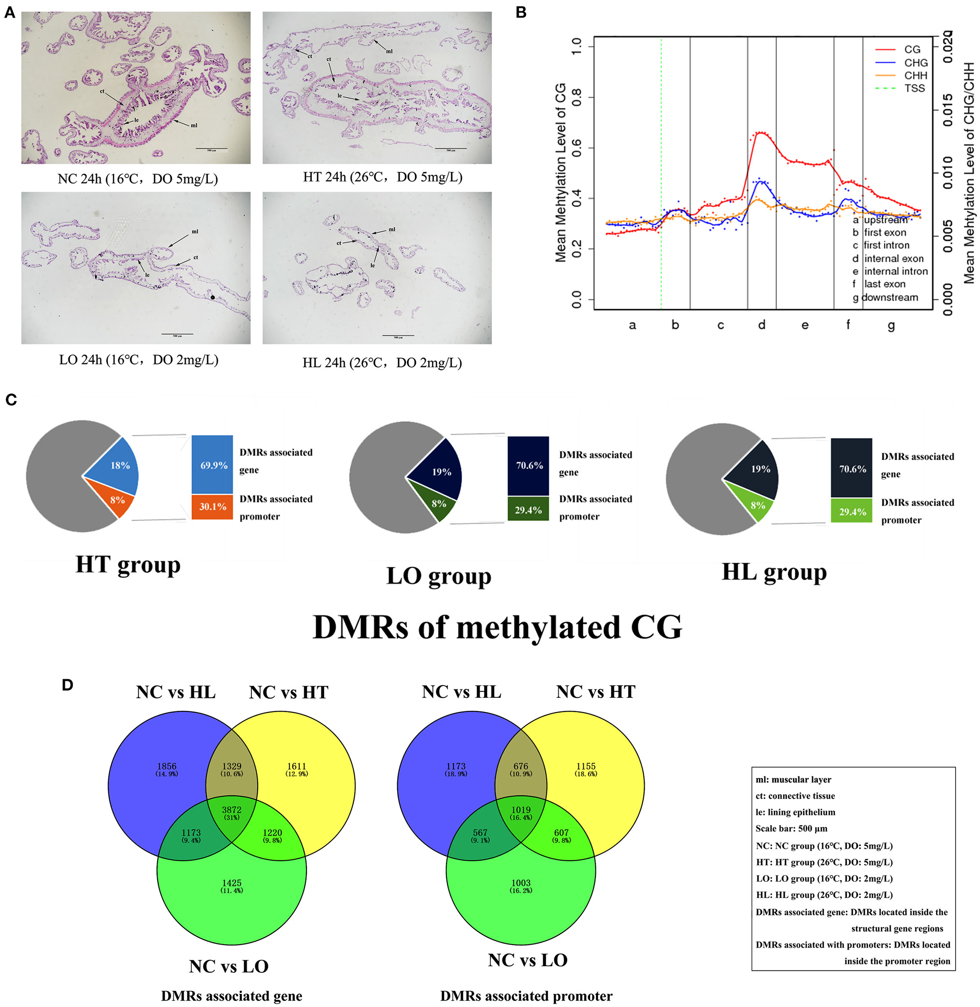 (A) Tissue section of the respiratory tree in A. japonicus under heat stress (26°C, 5 mg/L DO), hypoxia stress (16°C, 2 mg/L DO), heat–hypoxia stress (26°C, 2 mg/L DO), and NC group (16°C, 5 mg/L DO) for 24 h. ct, connective tissue; le: lining epithelium; ml, muscular layer. Scale bar 500 μm. (B) Canonical DNA methylation profiles of the entire transcriptional units of the NC group. (C) Pie chart proportion of DMR corresponding genes, promoters, and other regions. (D) Venn diagram of the DMRs in the NC, HT, LO, and HL groups.