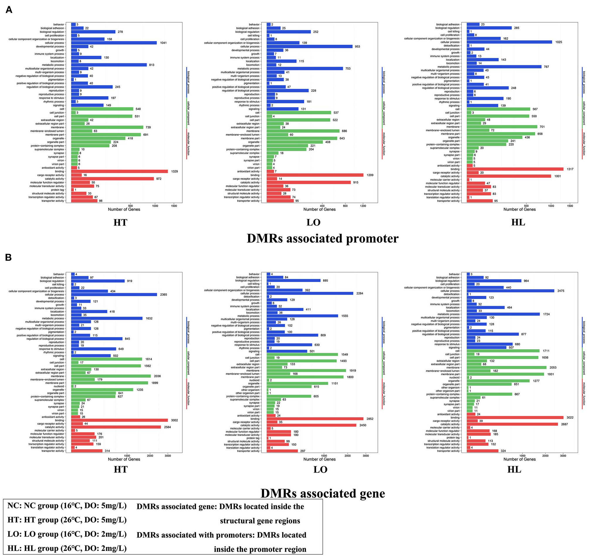 (A) Gene ontogeny (GO) assignments of DMRs associated promoters of HT, LO, and HL groups compared with NC group. (B) GO assignments of DMRs associated genes of HT, LO, and HL groups compared with NC group. The abscissa represents the number of genes or promoters associated with methylation, and the ordinate represents the GO terms. Different colors represent the three GO terms, such as cell components, biological processes, and molecular functions.