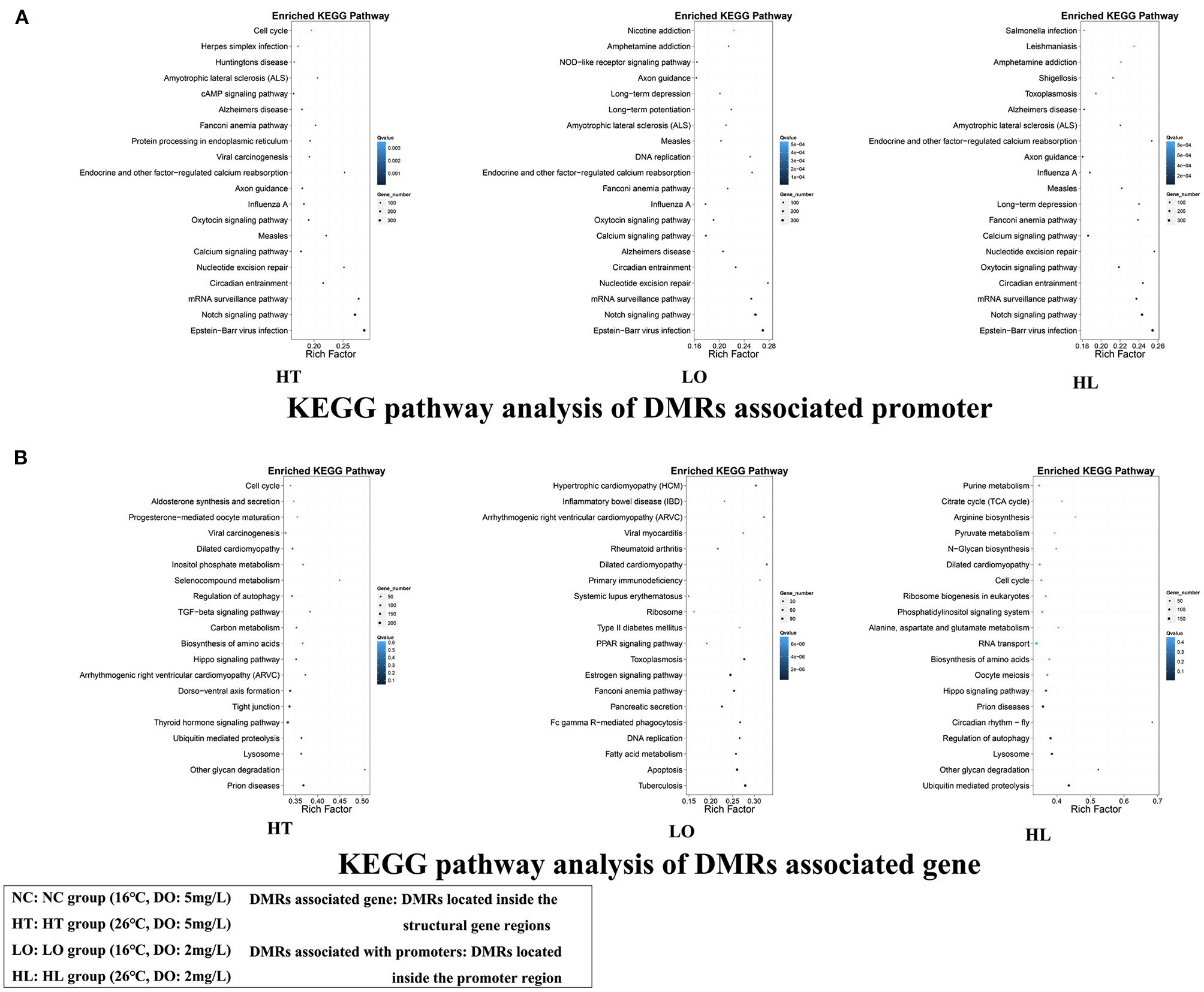 The DMRs associated with genes and DMRs associated with promoters were analyzed by GO and KEGG. The GO analysis showed that DMRs associated with genes or promoters were significantly enriched in the biological process of cellular process, metabolic process, cellular component of membrane, membrane part and molecular function of binding, and catalytic activity in all the three groups of HT, LO, and HL (Figure 2). Kyoto Encyclopedia of Genes and Genomes analysis showed that these DMRs associated with promoters were enriched in a notch signaling pathway and circadian rhythm in the groups of HT, LO, and HL (Figure 3A). The DMRs associated with genes were significantly enriched in ubiquitin-mediated proteolysis, lysosome, and other glycan degradation in the groups of HT and HL, while significantly enriched in apoptosis and fatty acid metabolism in the groups of LO (Figure 3B).