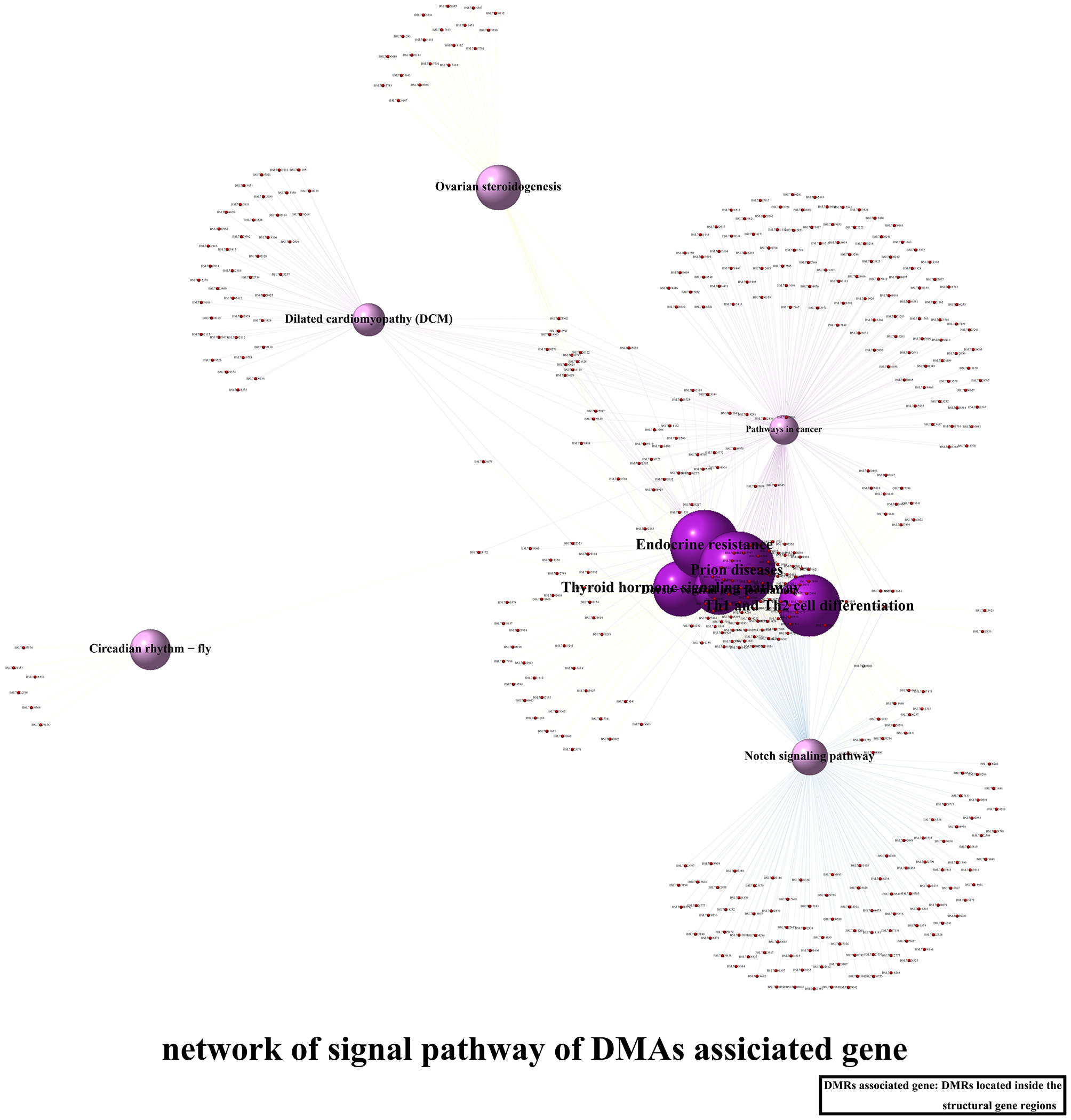 Network of signal pathways via the KEGG enrichment of DMRs associated genes in all of the three treatments groups simultaneously selected from Venn diagram.
