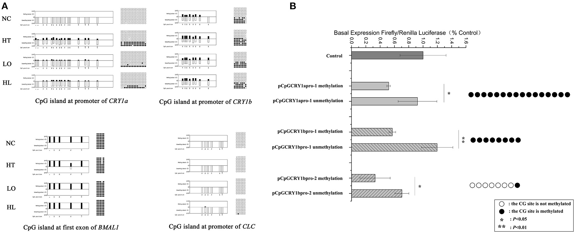 (A) Methylation sites of CRY1a, CRY1b, BMAL1, and CLC under heat stress, hypoxia stress, and heat–hypoxia stress. The histogram represents the proportion of methylation and unmethylation, black represents methylation and white represents unmethylation. Dot graph: each row represents a single clone, 10 replicates. Each dot represents a CpG dinucleotide, the white dot represents unmethylated CpG, and the black dot represents methylated CpG. (B) Promoter activity of CRY1a, CRY1b, CpGCRY1apro-1, and CpGCRY1bpro-1 selected all methylated sequences from (A), and CpGCRY1bpro-2 selected the methylation sequence at site 84 from (A) (the sequence was screened by repeated experiments).