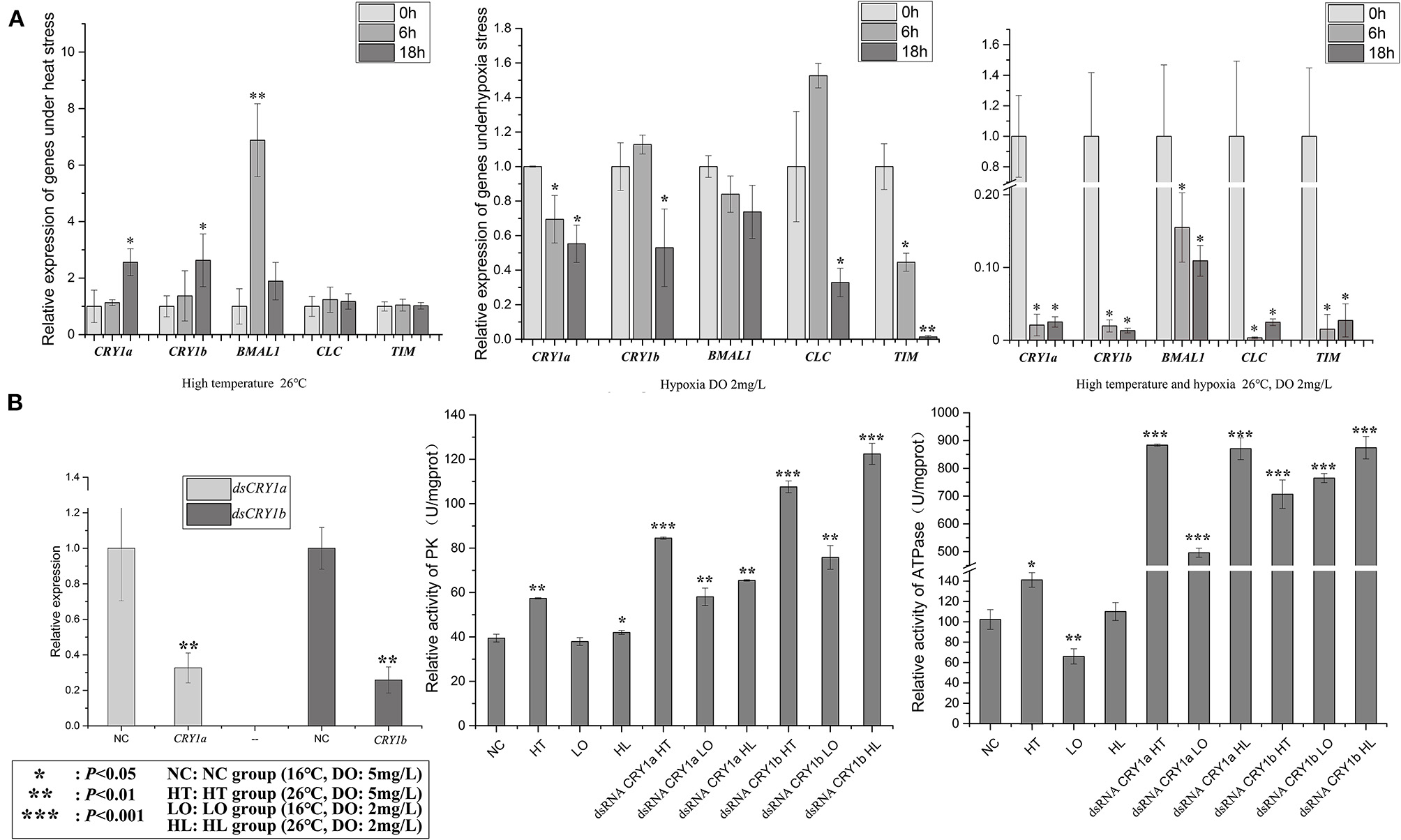 (A) The relative expression of genes of circadian rhythm under heat stress, hypoxia stress, and heat–hypoxia stress. (B) The relative expression of CRY1a and CRY1b after interference and relative activity of PK and ATPase under heat stress, hypoxia stress, and heat–hypoxia stress for 24 h and the interference groups of dsRNA CRY1a and dsRNA CRY1b under heat stress, hypoxia stress, and heat–hypoxia stress for 24 h.
