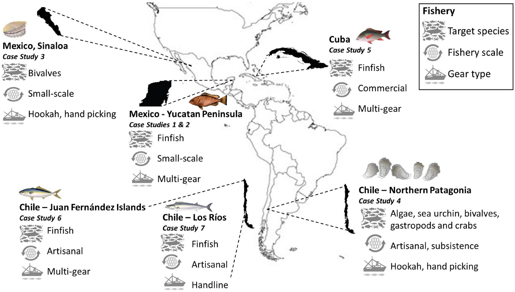 Fishery characterization of multispecies fisheries; commercial fisheries of the Yucatan Peninsula – Mexico, multispecies finfish fishery of the State of Yucatán – Mexico, multispecies Bivalve Fishery of Sinaloa – Mexico, Marine Coastal Areas of Indigenous People Caulín (MCAIP) Northern Patagonia – Chile, multispecies Finfish fishery of Cuba, the Forgotten Fish of Chile.