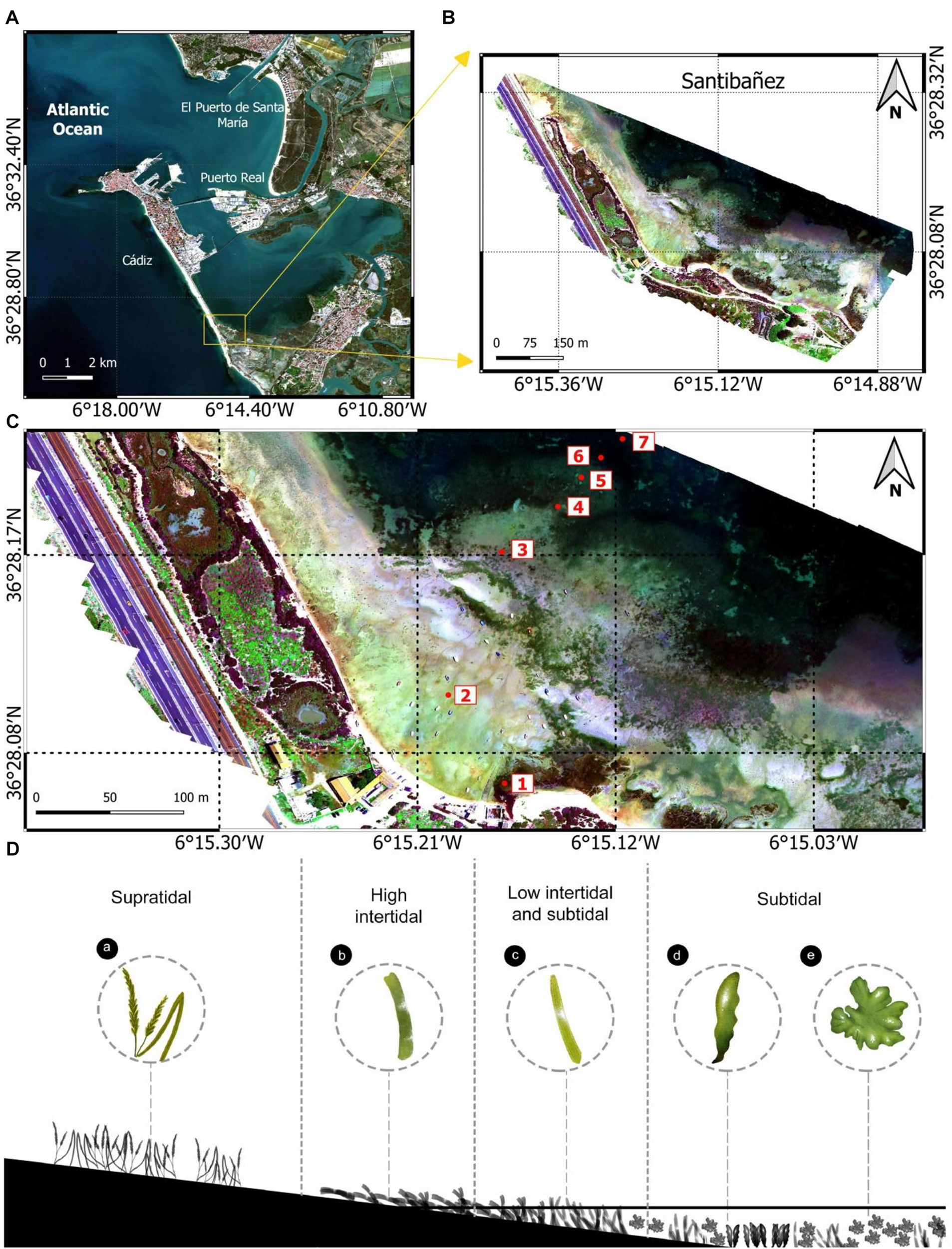 Figure 1. (A) Sentinel-2 image of Cádiz Bay (Spain). Framed in yellow, the study area of Santibañez. (B) RGB orthomosaic generated from images taken with the MicaSense RedEdge-MX dual multispectral camera. (C) Zoom of the study area in which the seven sampling points are represented, whose coordinates and taxonomic information are detailed in Table 1. (D) Diagram of the distribution of the different species monitored in Santibañez. From left to right: supratidal (a: Spartina maritima), high intertidal (b: Zostera noltei); Low intertidal and subtidal (c: Cymodocea nodosa, d: Caulerpa prolifera, and e: Ulva sp.).