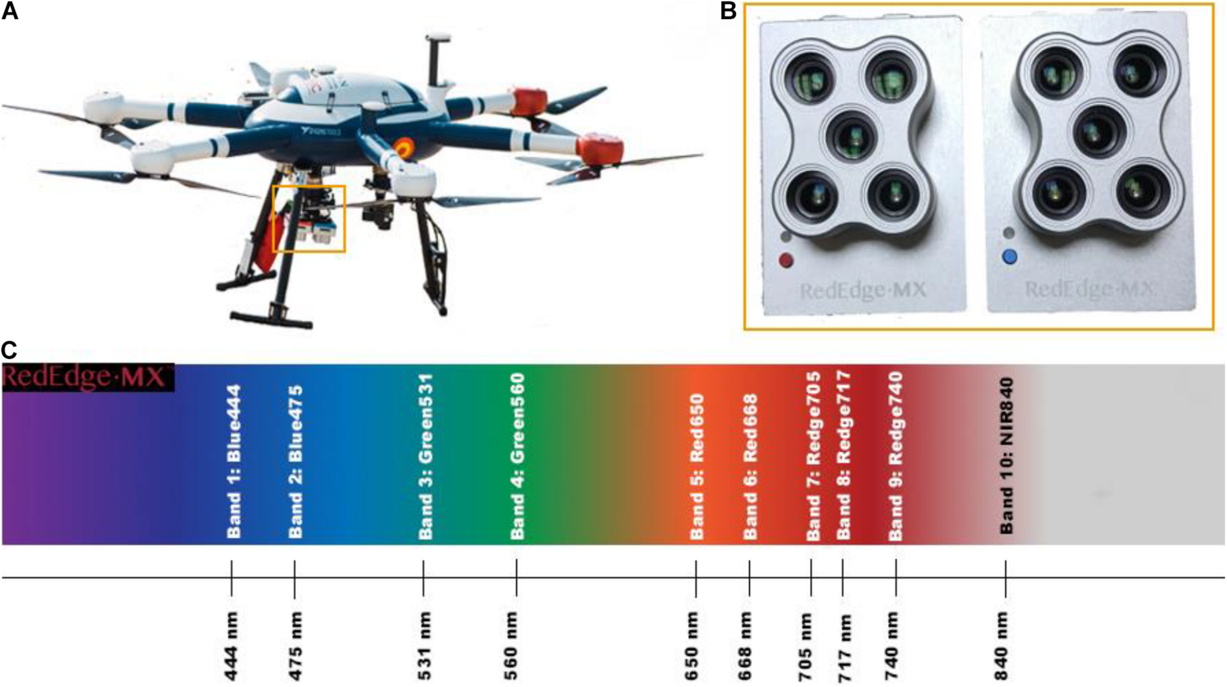 Figure 2. (A) The UAV (Condor, Dronetools©) equipped with the MicaSense RedEdge-MX dual multispectral camera (framed in yellow). (B) The ten bands dual multispectral camera (framed in yellow). (C) Representation of the spectrum from visible to non-visible light (range 400–900 nm). The bands of the multispectral camera are indicated.
