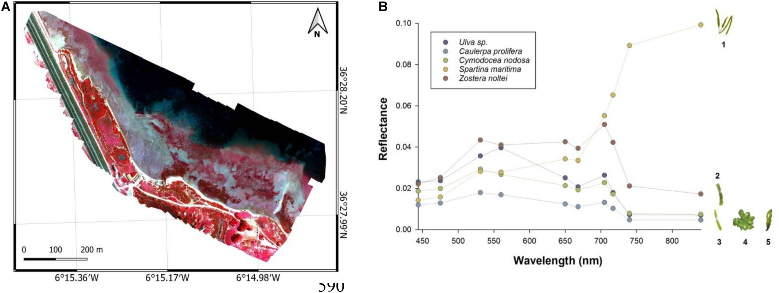 Figure 4. (A) False Composite formed by the combination of bands NIR, red and green (bands 10-6-4); (B) Spectral range of macroalgal species Ulva sp. (4, purple), C. prolifera (5, blue) and seagrasses C. nodosa (3, green), Z. noltei (2, red), S. maritima (1, yellow). The reflectance has dimensionless values between 0 and 1, with 1 being 100% of the reflectance.