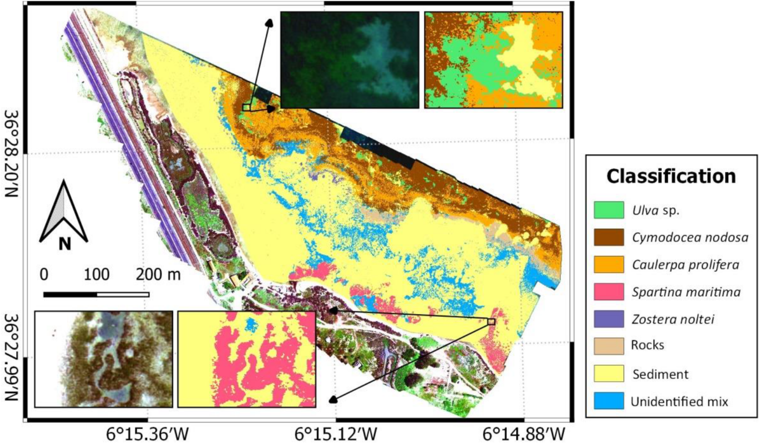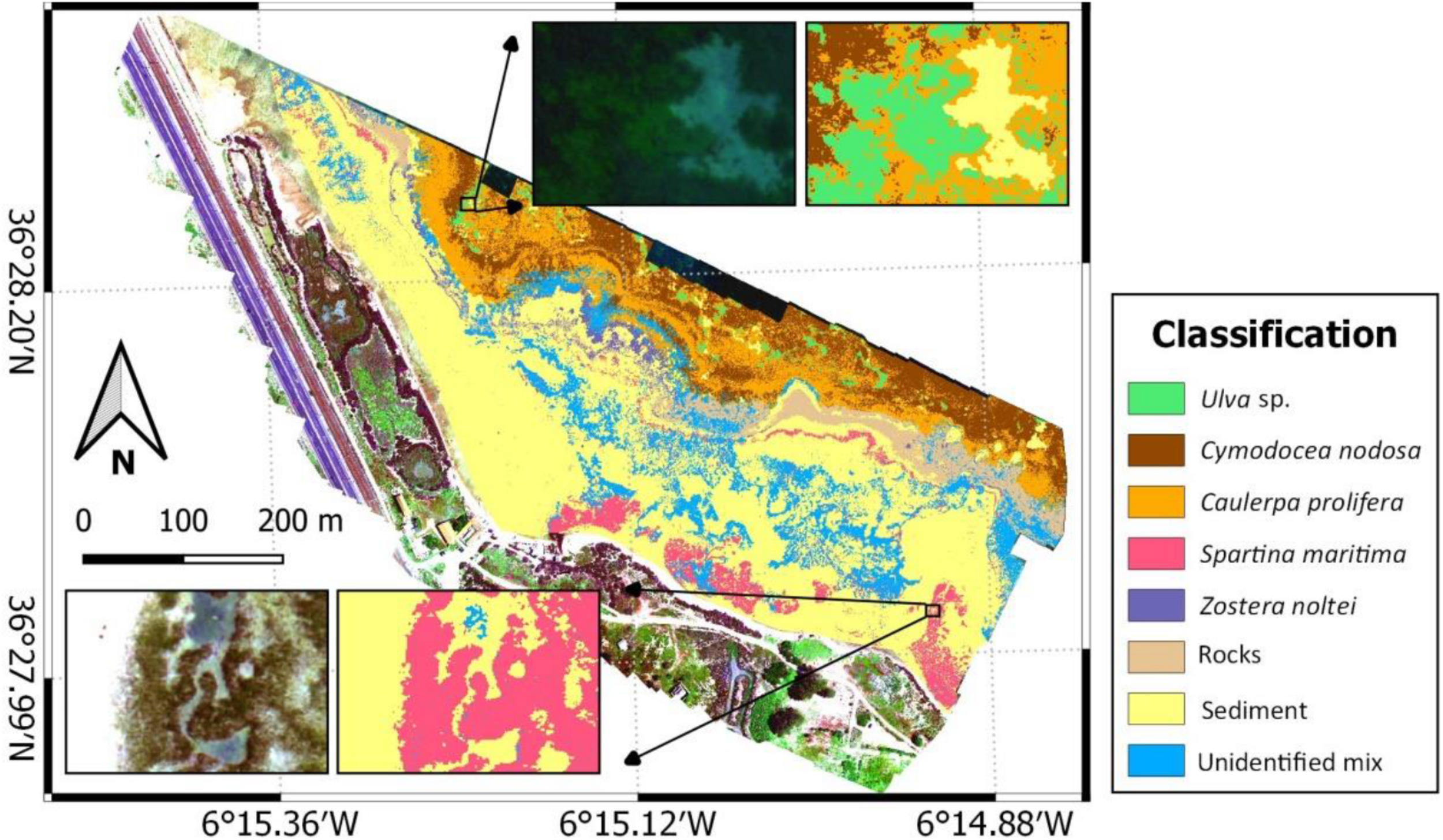 Figure 5. Maximum likelihood classifier, trained using image-derived spectra, result from the multispectral UAV survey in the study area. Coordinates are in WGS84 (EPSG: 4326).