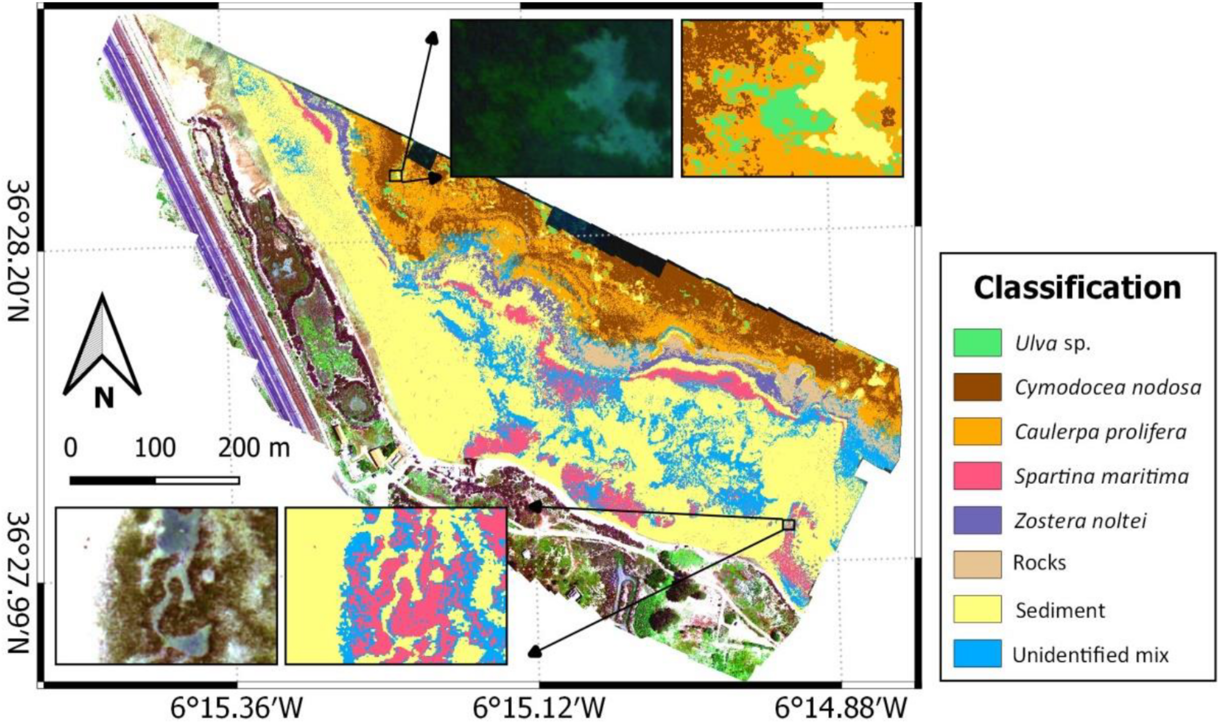 Monitoring and studying seagrass and macrophyte beds extent and location is therefore crucial for evaluating their ecological status and evolution (Kellaris et al., 2019; Veetil et al., 2020). Moreover, they are particularly useful as indicators of environmental quality, supporting decision-makers with issues of protection, restoration and conservation management of these habitats, as well as the management of commercially important macrophytes (Nahirnick et al., 2018; Wilson et al., 2020). Traditionally, monitoring and studying their health needs in situ sampling involving diving, which is time consuming, implying human and logistical resources, and providing only small spatial resolution (Kutser et al., 2006; Beca-Carretero et al., 2020; Veetil et al., 2020). Currently, the use of remote sensing imagery is increasing the accuracy and efficiency of monitoring on a broader scale (Beca-Carretero et al., 2020; Kaufman and Bell, 2020), serving as an added-value to traditional techniques. However, there are still limitations in the use of remote sensing satellite, so that even the finest spatial resolution of their sensors are insufficient to taxonomically detect coastal vegetation species in submerged areas with precision (Nahirnick et al., 2018; Veetil et al., 2020). In this sense, the use of unmanned aerial vehicles (UAV)-mounted sensors could be a suitable alternative.