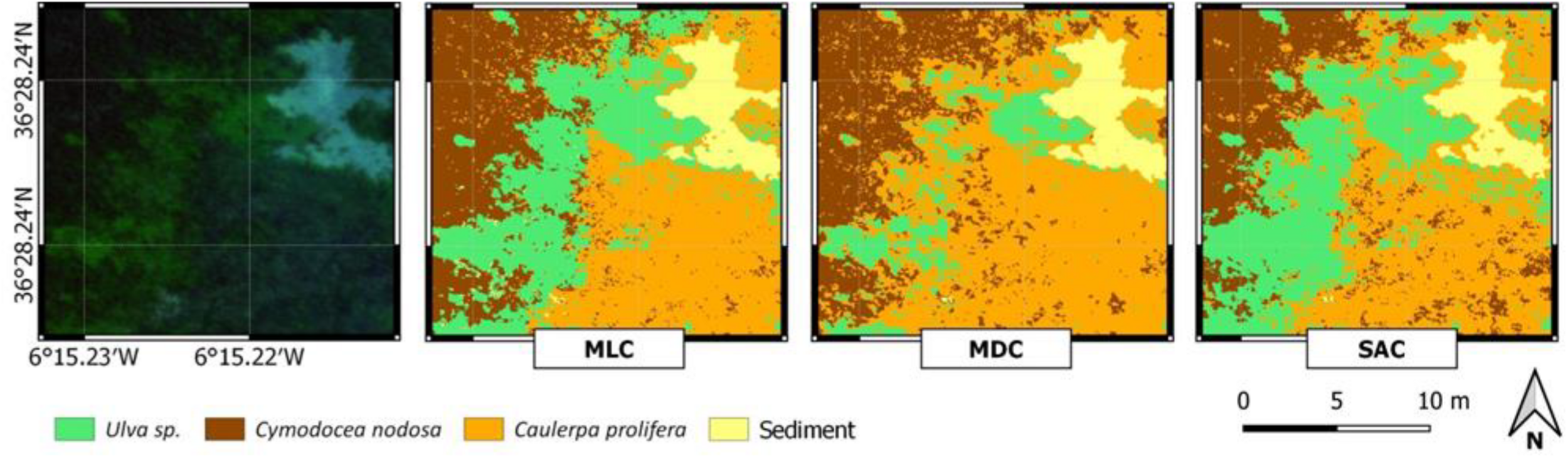 Figure 8. Zoom of the study area where the following species can be visually identified: Ulva sp., C. nodosa, and C. prolifera. A comparison is made between the results obtained by applying the MLC, MDC, and SAC algorithms to make the supervised classifications.