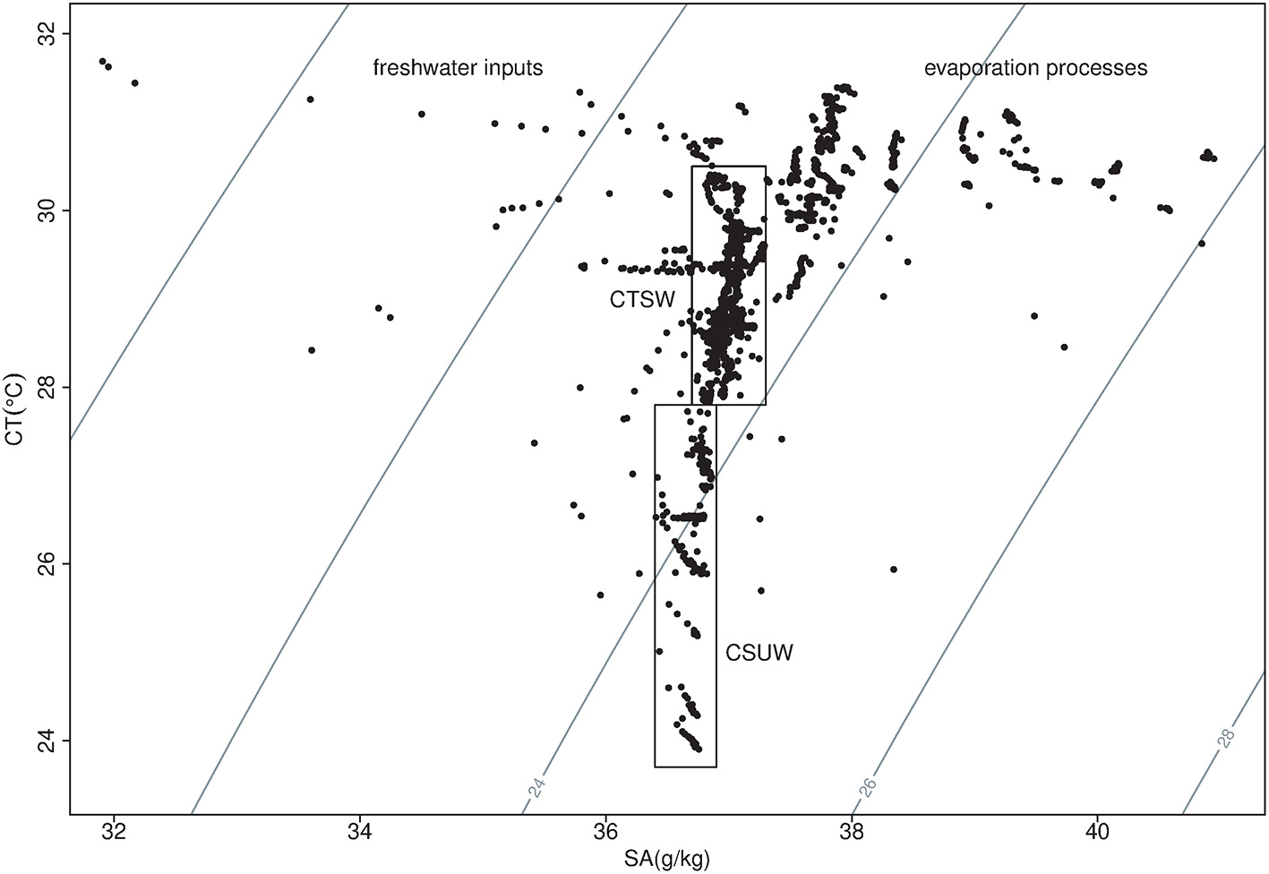 Temperature (conservative temperature) and salinity (absolute Salinity) diagram for July 2018. Water type signatures found during this survey are as follows: (1) The CTSW—Caribbean Tropical Surface Water, and (2) the CSUW—Caribbean Subtropical Under Water. Contours represent σθ values.
