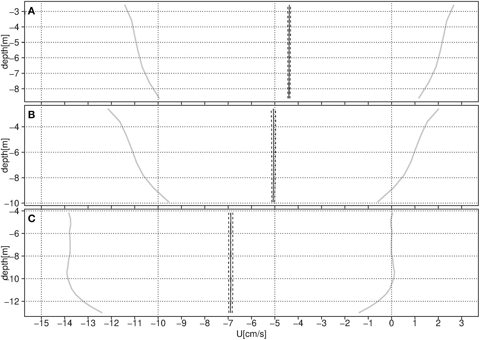Mean zonal current profile (U in cm/s) for (A) Lerma, (B) Champoton, and (C) Chenkan. Solid line—mean profile, dash line-−95% CI, and gray solid line—one SD.