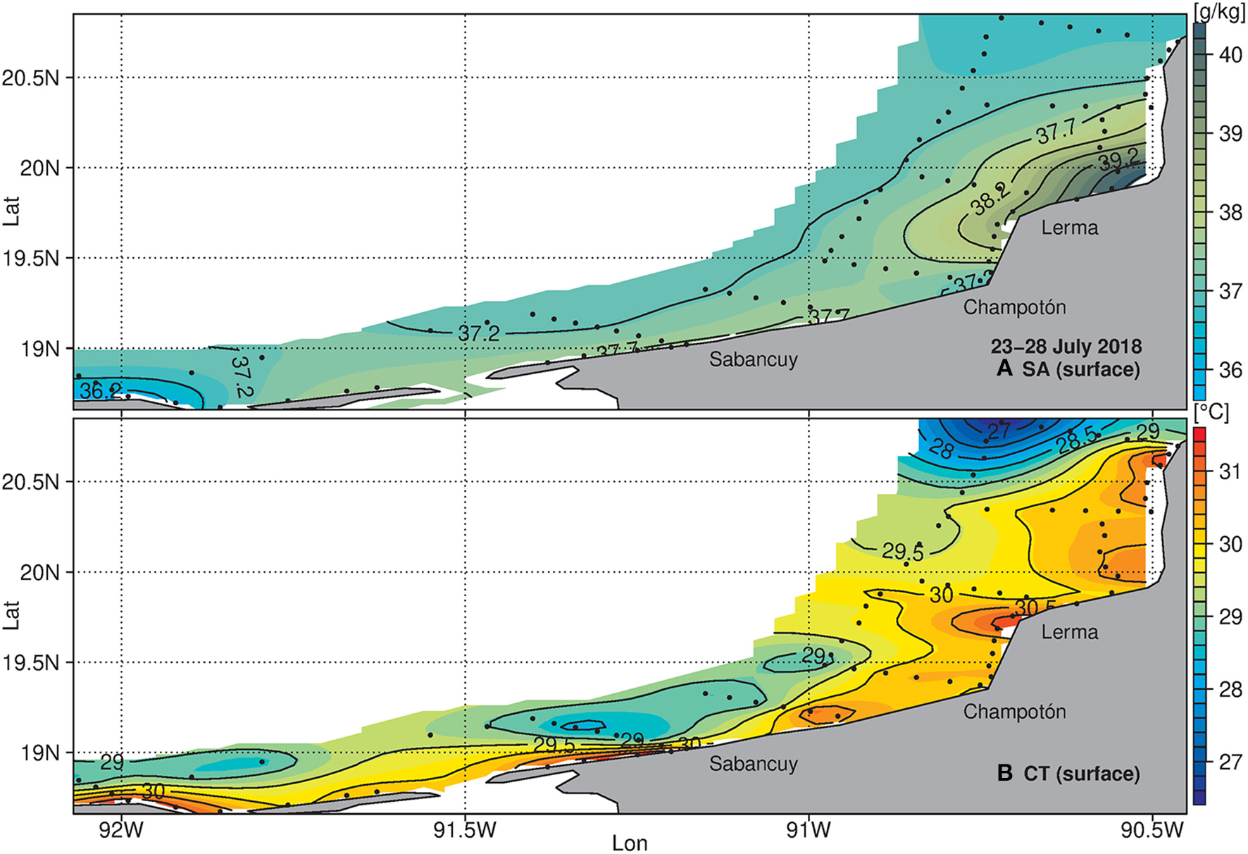 Figure 4 shows the surface salinity and temperature distribution during the days of the survey, which can be thought of as a 6-day composite of observations. At the northwestern edge of the sampling region (off Isla Arena), upwelled waters coming from the Yucatan coast entered the study area bringing colder temperatures and mild salinities (27°C and 37.2 g/Kg, respectively). From Isla Piedra to Lerma, salty and warm CTSW values were found, located over a very shallow depth (notice the −5 m contour in Figure 1), that prevented the upwelled waters from approaching the coast. From Champoton to the rest of the study area, upwelled waters were seen furthest to the coast. Off Terminos lagoon (at 92°W, 18.5°N), the flushing waters from this body of water expelled warm and less salty water (30°C, 36.2 g/Kg, respectively) through its southern mouth, Boca del Carmen, to the adjacent ocean.
