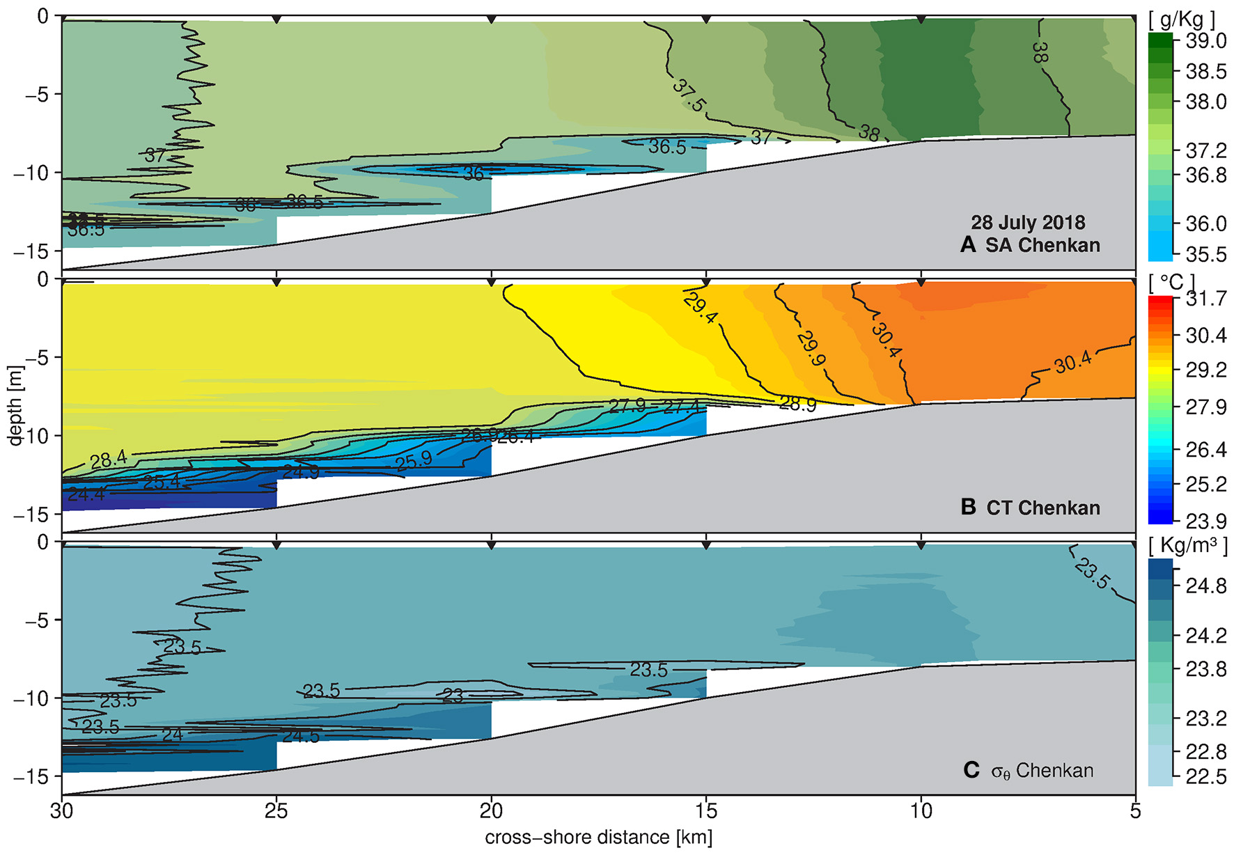 Cross-shore view of the vertical distribution of (A) absolute salinity (g/Kg), (B) conservative temperature (°C), and (C) density (σθ in kg/m3), off Chenkan locality (L1 on Figure 1). Black triangles on top depict sampling stations. This figure represents the observations taken during July 28, 2018.
