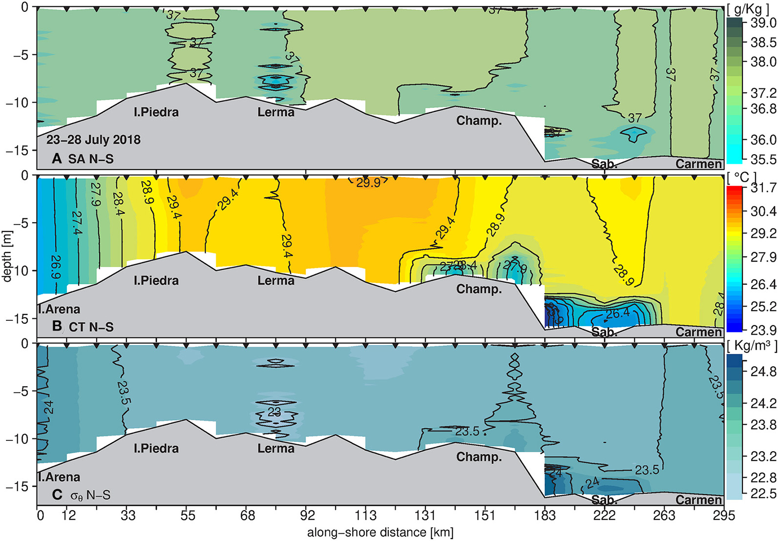 Along-shore view of the vertical distribution of (A) absolute salinity (g/kg), (B) conservative temperature (°C), and (C) density (σθ in kg/m3), for the sampling stations aligned from north to south (L2 on Figure 1). Black triangles on top depict sampling stations. This figure synthesizes 6 days of observations, from July 23 to July 28, 2018.