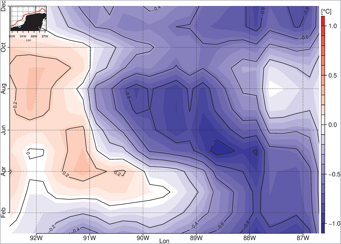 Using a Hövmuller diagram (Figure 9) of the along-shore SST anomaly distribution from the Caribbean Sea (87°W) until the Tabasco coast (>92°W), we explored the regularity of the advected upwelled waters over the western coast, where cooling events are related to negative anomalies (blue color values). From the eastern side of the shelf until the Campeche coast, cooling events are seen along-shore all year-round. Although SST is related to different surface heat budget processes and could be noisy to be attributed solely to the upwelling events, it showed an interesting resemblance to the findings of Merino (1997) and Ruíz-Castillo et al. (2016), exhibiting colder SST anomalies between July and August (in summer) off Campeche, and between April and August (spring and summer) off the Yucatecan coast. During winter (from January to March), surface cooling events encompassed all the region, from the Caribbean until Tabasco, although SST anomalies were low and are rather related to the synoptical effect of the northerly cold wind burst events that affect the GoM.