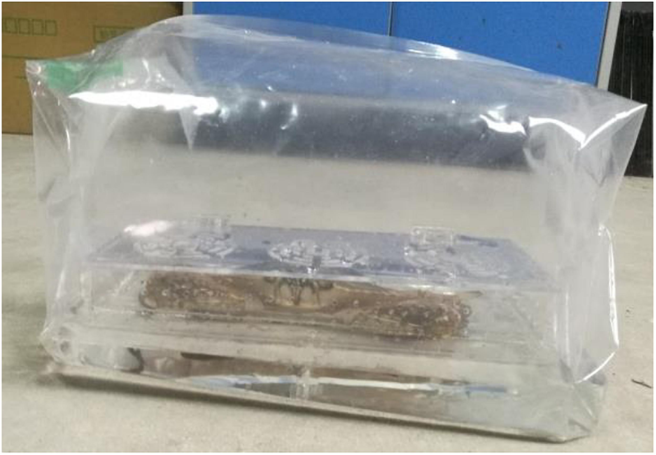 To investigate the survival time, crabs were randomly distributed into four groups (25 crabs per group). The crabs were starved for 24 h before the experiment. A plastic box (17.5 cm × 13.5 cm × 7.5 cm) with holes on the bottom and top and a plastic bag (30 cm × 17 cm) equipped with an air-tight type air tap were used to hold one live crab (Figure 1). First, a crab was placed into the plastic box to prevent the plastic bag from being punctured by the crab’s hard shell. Next, the plastic box containing the crab was placed into the plastic bag containing 0.7 L seawater (salinity 24 ppt). Then, the air was extracted from the bag, and the bag was sealed with a heat sealer. Finally, 4.8 L of oxygen was added into the bag through the air tap, and the tap was closed to prevent gas leakage. After packaging, all crabs were transferred to 12°C with one replicate group per incubator. The temperature was set based on the results of Dong et al. (2019). The crabs were starved during the experiment. The number of dead crabs was recorded every 12 h. Mortality was determined based on the somatic response, as Barrento et al. (2011) and Lu et al. (2016) described and discarded.