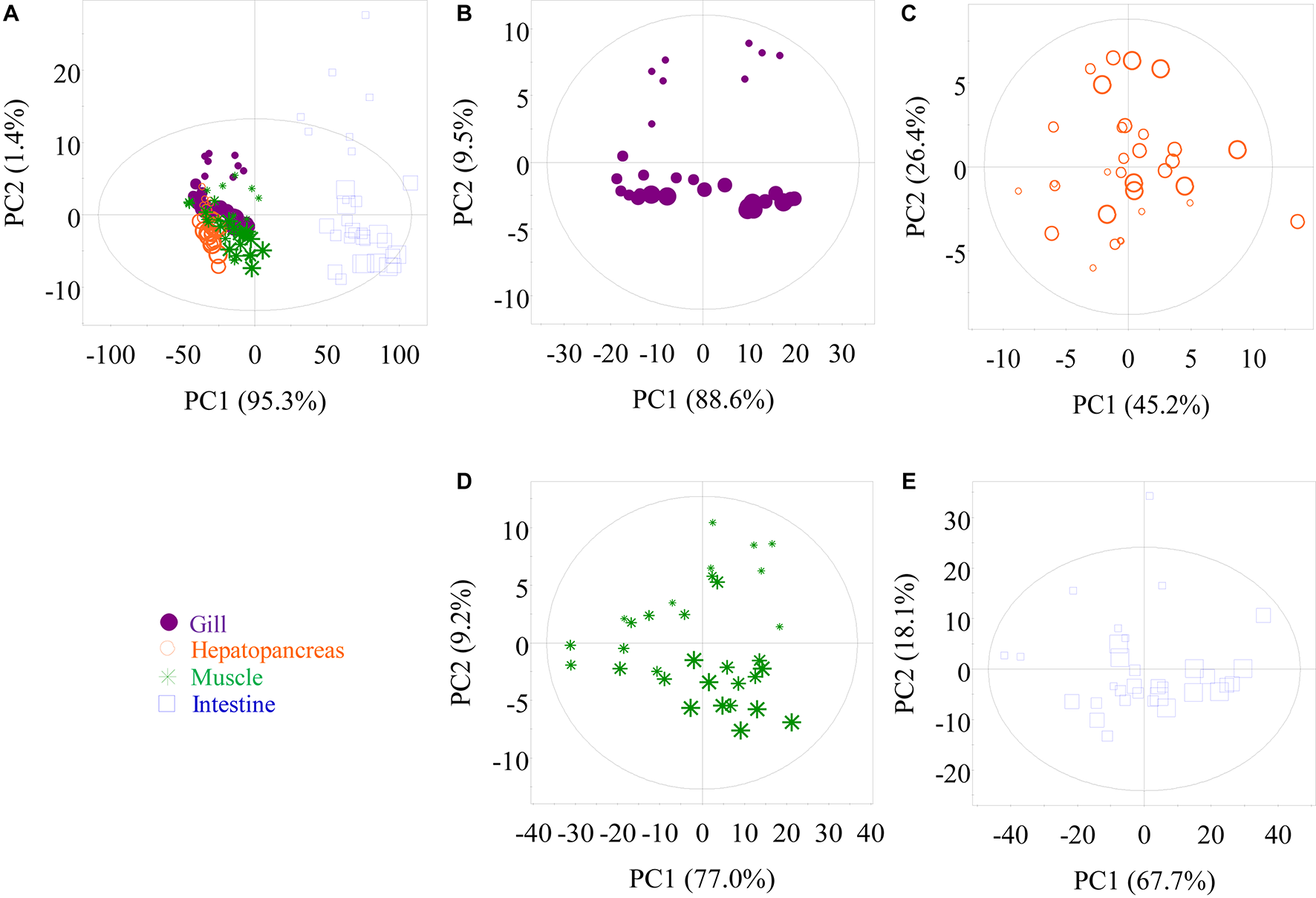 Untargeted 1H NMR spectra for low-molecular-weight metabolites in crab tissues were acquired to investigate the metabolic changes in gills, hepatopancreas, muscle, and intestine when P. trituberculatus were kept in the oxygen-filled bag containing seawater at 12°C. The assigned metabolites in the crab tissues are listed in Supplementary Table 1 with 1H and 13C NMR data. In multivariate data analysis, PCA score plots based on the first and second principal components (PC1 and PC2) were obtained from all 1H NMR spectral data obtained from aqueous methanol extracts of the four tissues (Figure 3). The PCA results differentiated the intestinal tissue and the other three tissues in PC1 (Figure 3A). Notably, six outliers were observed for the intestinal extracts in this PCA plot. However, these intestine samples were still included in subsequent analyses as the distinct metabolomic profile of the intestine compared with that of the other three tissues may result in these outliers. This view was supported by the plot in Figure 3E, where only one sample was outside the confidence ellipse. Furthermore, in Figure 3A, minor clustering was observed among gill, hepatopancreas, and muscle. Although tissue type played a dominant role in separating crab metabolic profiles, transport time still played an essential role in the metabolite changes in some tissues. The metabolite changes in the gill, muscle, and intestine displayed a time-dependent pattern (Figures 3B,D,E), whereas no apparent clustering was observed among the four hepatopancreas samples at different sampling times (Figure 3C).