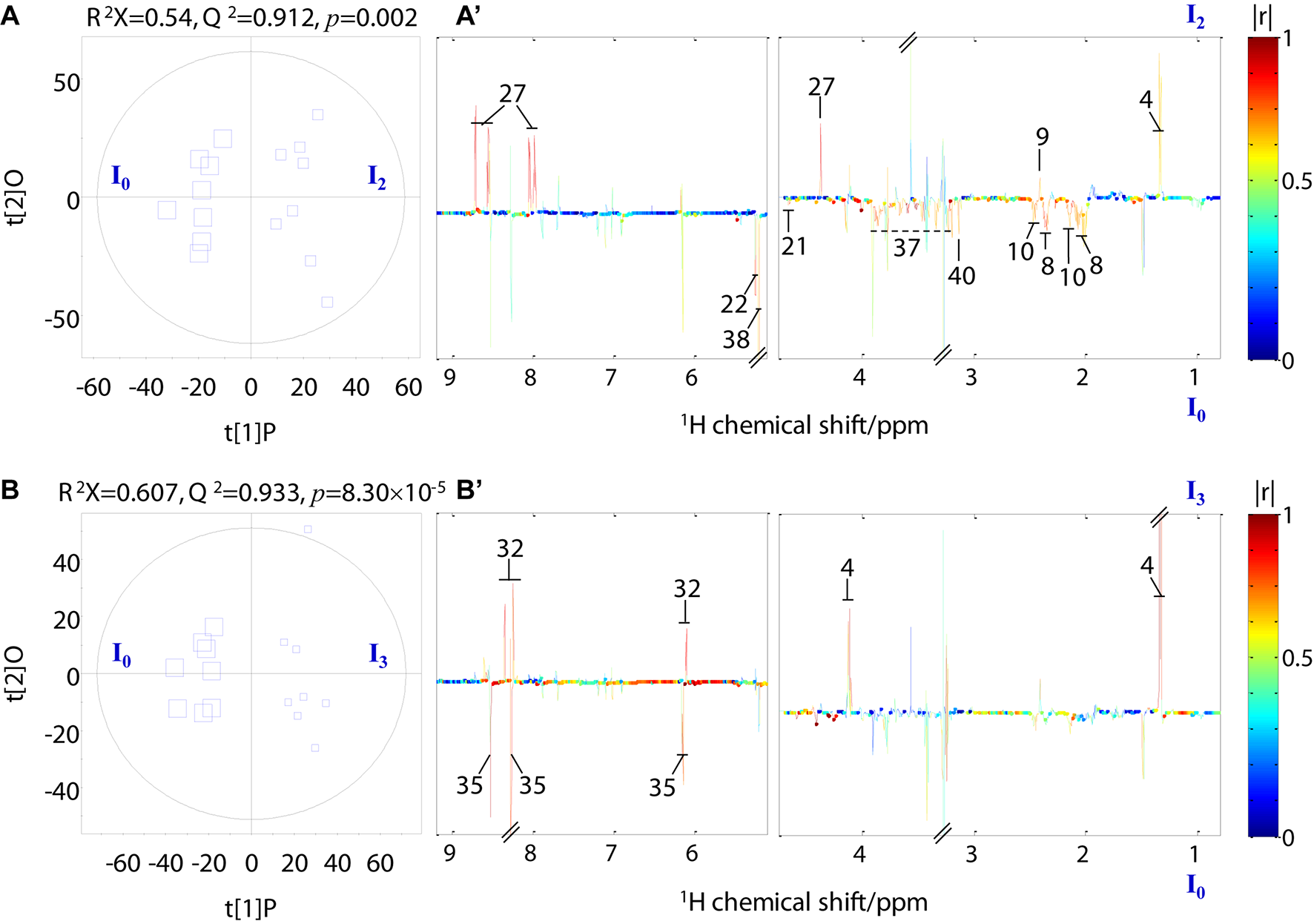 Orthogonal projection to latent structures with discriminant analysis scores (A,B) and coefficient-coded loading plots (A’,B’) for the intestine models discriminating crabs at day 0 (I0, square size 40), crabs at day 2 (I2, square size 24), and crabs at day 3 (I3, square size 16). Metabolites: 4: lactate; 9: succinate; 27: 2-pyridinemethanol; 8: glutamate; 10: glutamine; 21: glucose; 32: inosine; 35: ATP; 38: trehalose; 40: choline-O-sulfate.
