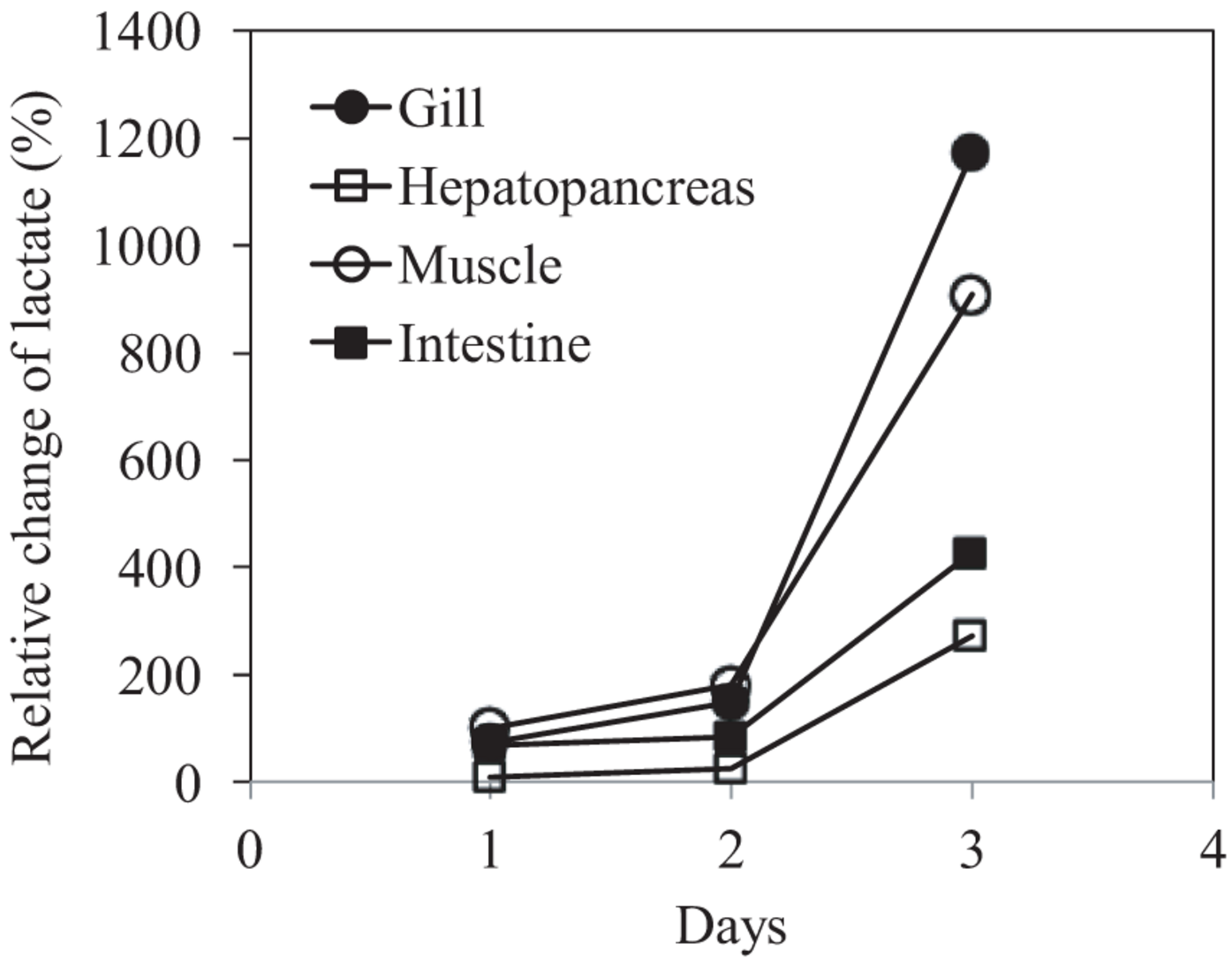 The changes in the concentration of this organic acid in the four tissue types with time compared with their control counterparts were calculated to examine the temporal dynamics of lactate concentration. Overall, a gradual elevation in the lactate level was observed in all tissues throughout the experiment (Figure 6). The highest accumulation of lactate was found in the gill and muscle tissues at day 3, increased by 1172.4 and 908.8%, respectively, relative to their control counterparts; hepatopancreas and intestine, respectively, showed 427.7 and 273.2% increases.