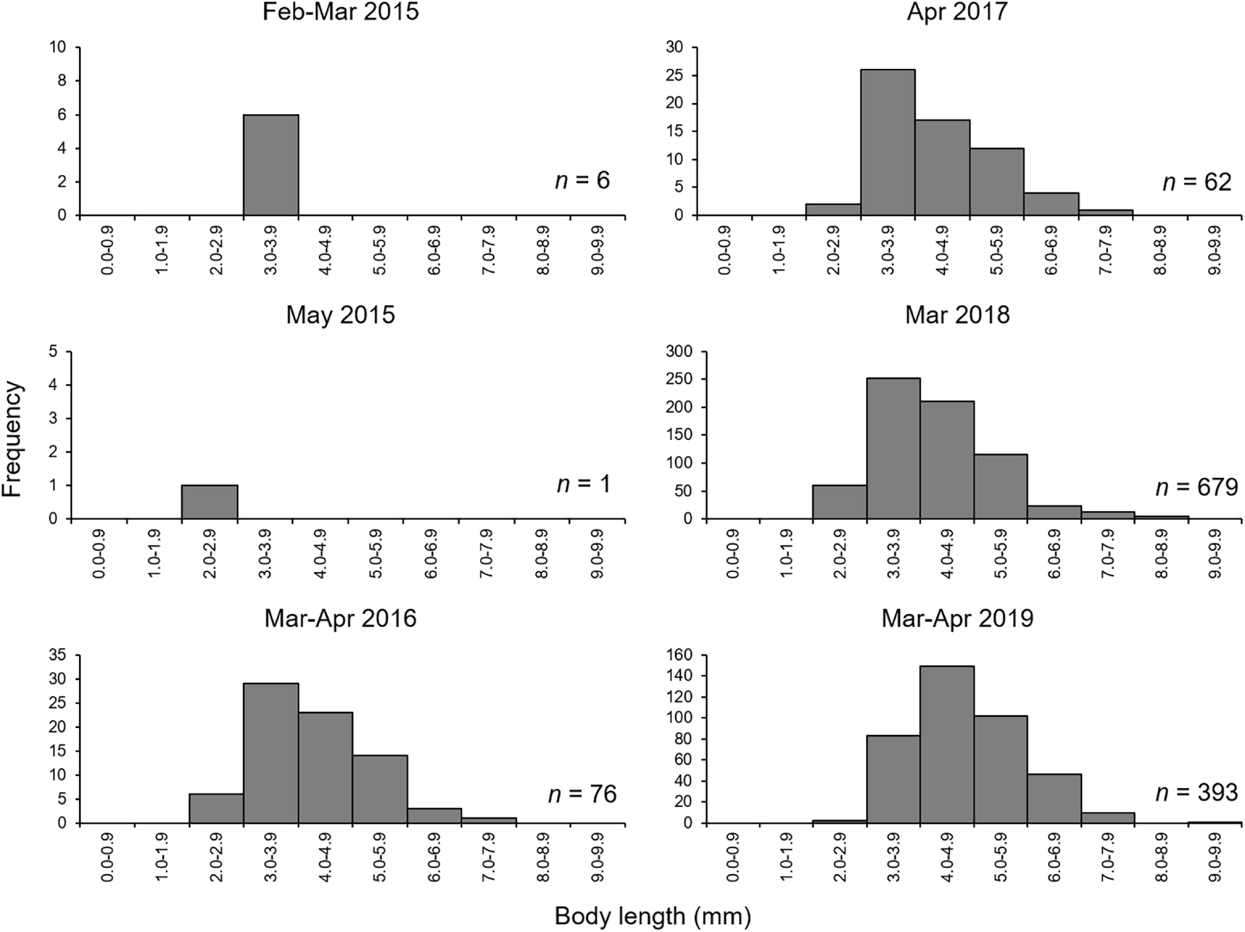 The larval stages were recorded (preflexion, flexion, and postflexion) and the body length (BL; notochord length for preflexion and flexion larvae, and standard length for postflexion larvae) of each specimen was measured to the nearest 0.1 mm, using image analysis software (NIS-Elements D 3.1, Nikon Corporation) and a binocular stereomicroscope (Nikon SMZ1500, Nikon Corporation). For specimens collected in 2018 and 2019, when the sample size was much larger than that from the previous three years, the BLs of a maximum of 100 specimens were measured at each station. The BL composition of Scomber spp. larvae was summarized for each study period (February 17–March 6, 2015, May 28–30, 2015, March 22–April 5, 2016, April 4–5, 2017, March 24–29, 2018, and March 25–April 2, 2019).