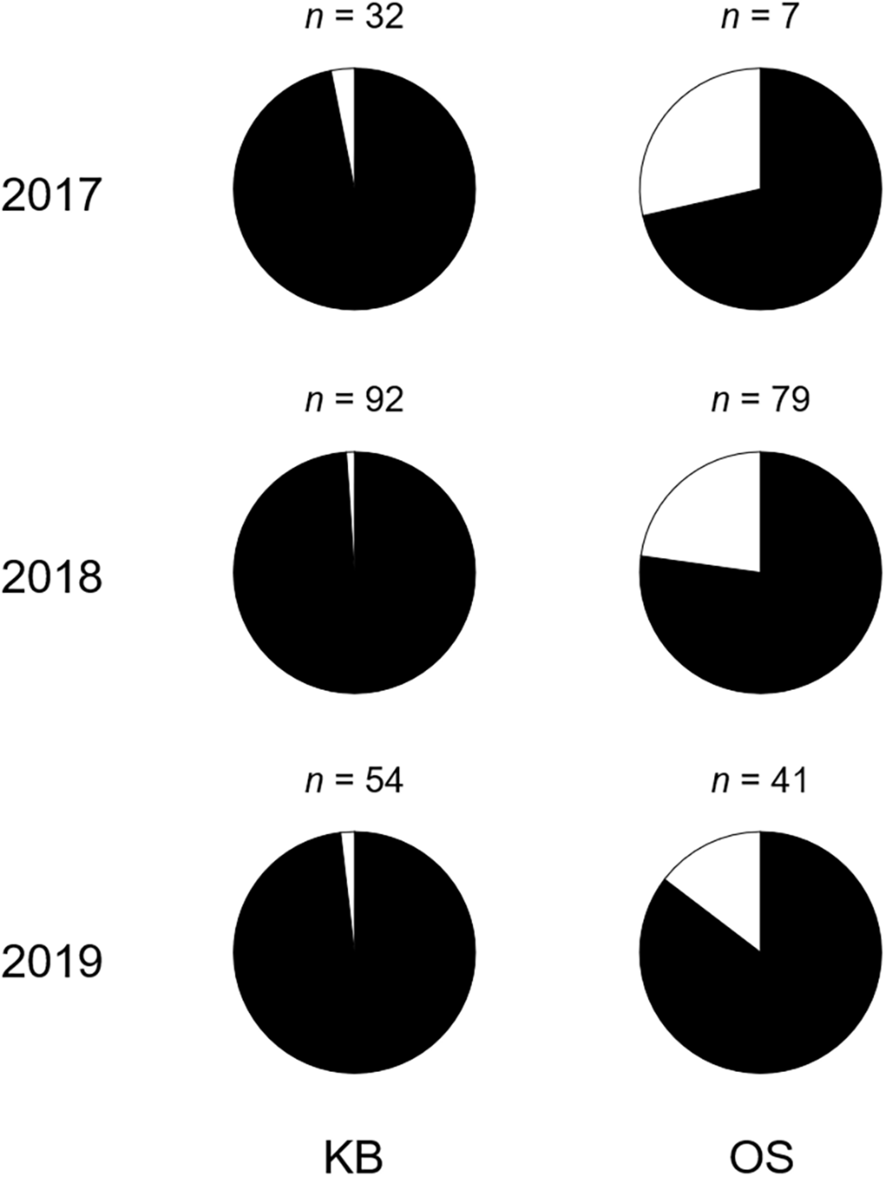 Composition of Scomber japonicus (black) and S. australasicus (white) larvae in the mouth of Kagoshima Bay and the Osumi Strait from 2017 to 2019, identified using PCR-RFLP. KB and OS indicate the mouth of Kagoshima Bay and the Osumi Strait, respectively. Numbers indicate sample size.