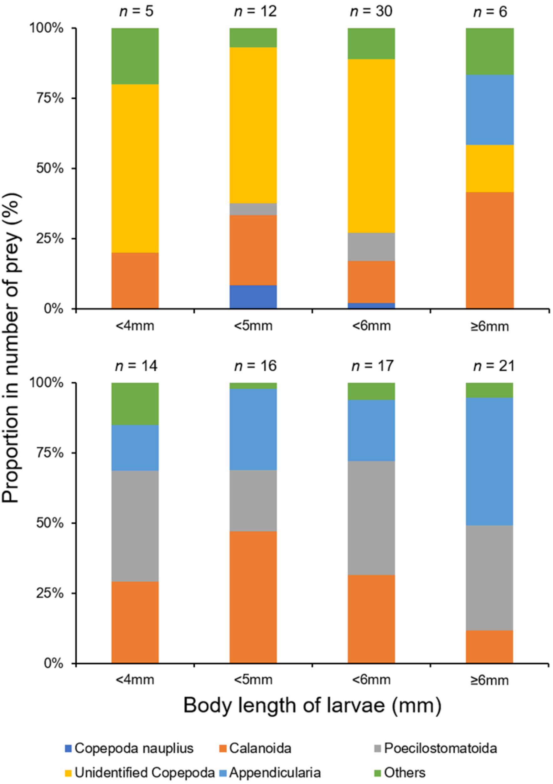 Ontogenetic variations in mean percentage number of prey in the diet of Scomber japonicus larvae, based on both morphological (top) and DNA metabarcoding (bottom) analyses. Numbers indicate sample size.