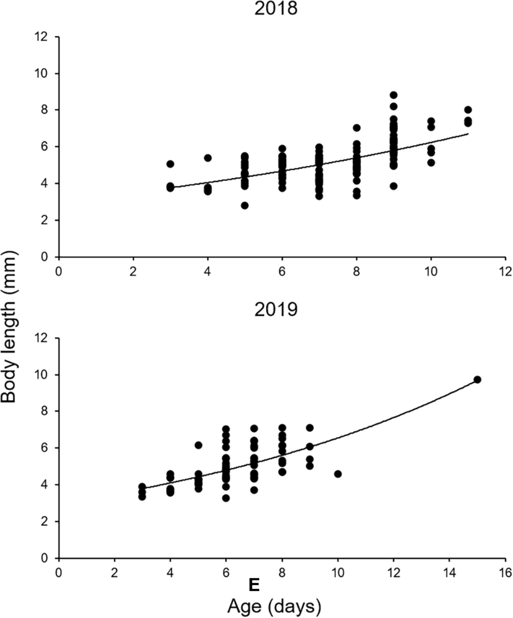 The larvae were randomly chosen from the specimens preserved in 99.5% ethanol in 2018 and 2019 that were identified as S. japonicus by the PCR-RFLP. The sagittal otoliths were dissected from larvae (n = 227) and embedded on a glass slide with enamel resin using a binocular stereomicroscope. The total number of otolith increments was counted using image analysis software (NIS-Elements D 3.2, Nikon Corporation) under a binocular light microscope (Nikon ECLIPSE 50i, Nikon Corporation). In the analysis, the first increment was defined as the hatch check, and the total number of increments on the outside of the hatch check were used to elucidate age, following Sassa and Tsukamoto (2010).
