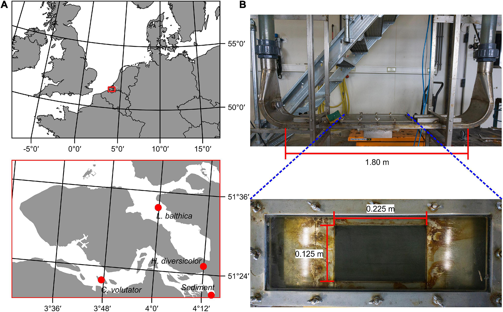 (A) Sampling locations of selected species and sediment in the Scheldt estuary, Netherlands. (B) The OsCaR flume. A piston in one of the vertical tubes drives an oscillatory flow over the sediment core, which is pushed into the flume channel from below.