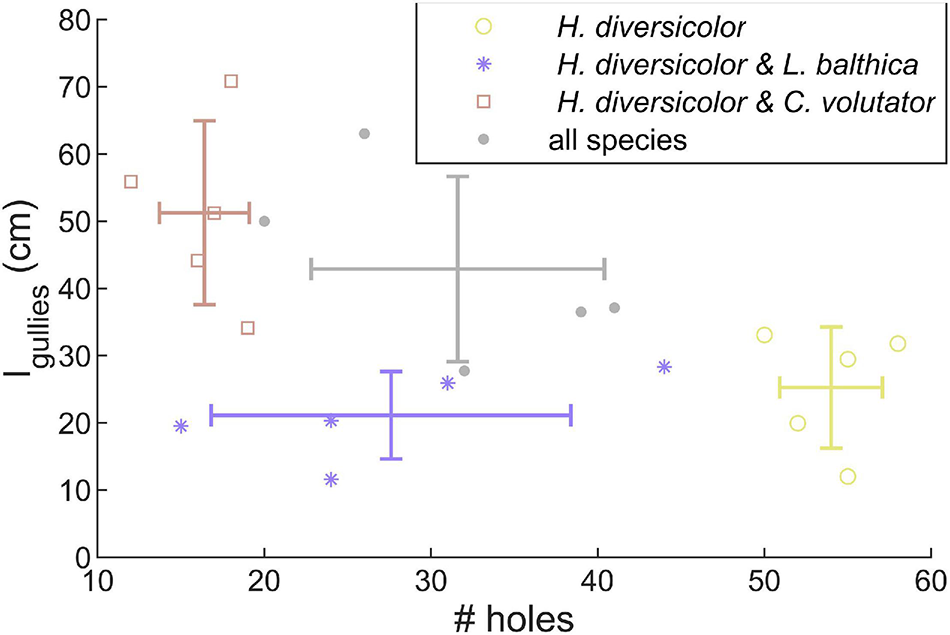 Number of holes and total length of gullies created by H. diversicolor depend on the presence of other species. Lines show means ± SE.