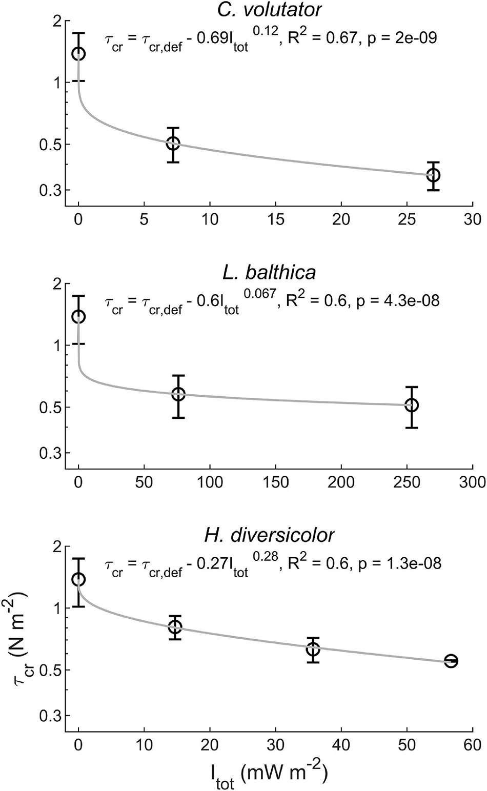 When macrobenthos were introduced to the sediment, the erosion threshold decreased by a factor of two to three (Figure 4). This reduction in τcr depended strongly on the specific species (p < 0.01) and on the individual density (p < 0.01), albeit that a higher individual density generally caused a much smaller reduction in τcr compared to adding a species to defaunated sediment. Interestingly, while having the lowest total metabolic rate of all tested species, C. volutator caused the largest reduction in τcr, followed by L. balthica and H. diversicolor, respectively (Figure 4). The effect of individual density on τcr reduction was largest for H. diversicolor, followed by C. volutator and L. balthica, respectively (Figure 4). Overall, the observed reduction in τcr could be explained by a power function:
