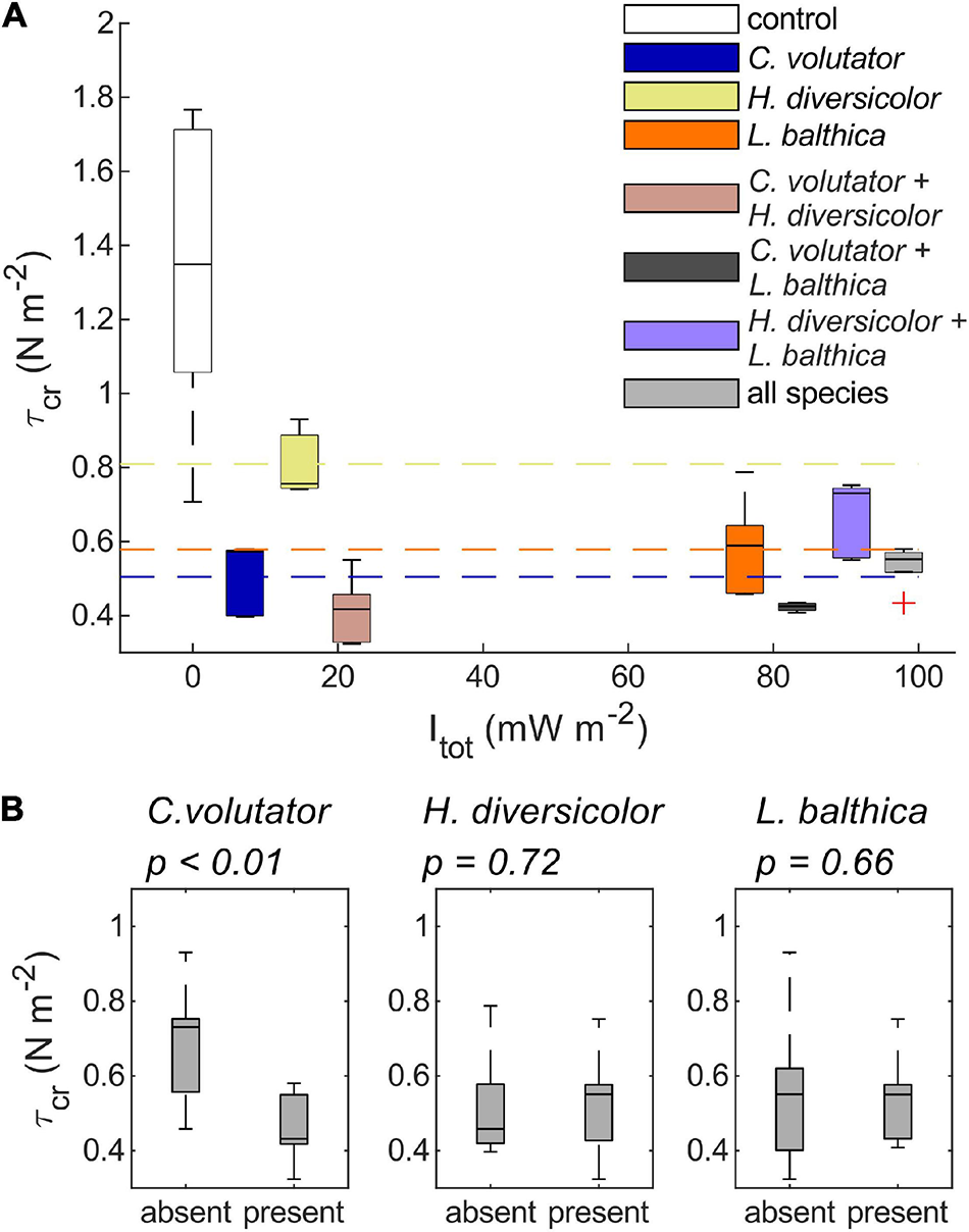 Overall, the results from the benthic community experiments indicate that the erodibility of natural sediments is dominated by the species that has the largest individual effect on sediment erodibility, here primarily C. volutator or L. balthica when combined with H. diversicolor only (Figure 5 and Table 3), rather than the species that is dominant in terms of total metabolic rate. That is, the addition of C. volutator to a single species or a benthic community caused a significant reduction in τcr compared to benthic communities where C. volutator was absent (Figure 5, p < 0.01). As a result, τcr of the sediments with a benthic community containing C. volutator was similar to the values of τcr induced by low densities of C. volutator in the single species scenarios, showing that the addition of H. diversicolor, L. balthica, or both to C. volutator did not cause a significant change in τcr (Figure 5 and Table 3, p = 0.22, 0.69, and 1, respectively). Even though the bioturbation activity of H. diversicolor was visually observed to increase once C. volutator was added to the sediment (Figures 2, 3), this did not have measurable effects on sediment erodibility. These findings indicate that the addition of an extra species to a benthic communities does not necessarily induce a significant further reduction of τcr.