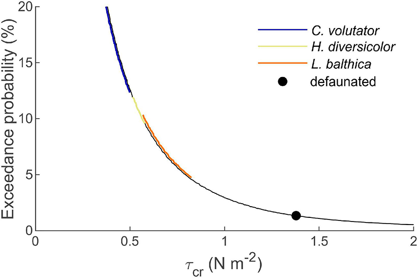 Exceedance probability of a given wave-induced τcr for a typical tidal flat in the Western Scheldt estuary. Colored lines (shifted horizontally for visualization purposes) correspond to the τcr range of the indicated species. As exceedance probability increases exponentially with reducing τcr by, e.g., bioturbation, tidal flat morphodynamics are dominated by key benthic species causing the largest τcr reduction, as these have a disproportionate effect on τcr exceedance probability.